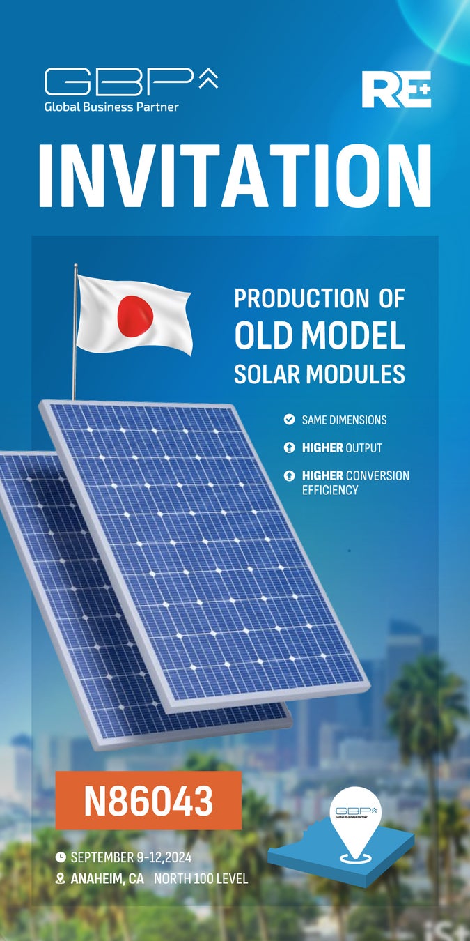GBPは、2024年9月9日から12日に、アメリカのカルフォルニアで開催されるRE+ 24に出展します。日本で実績豊富な旧型番太陽光パネルの代替品、およびアメリカ市場向けの新製品を披露します。