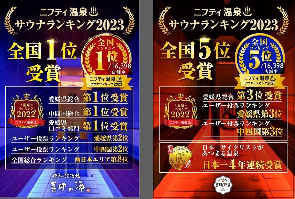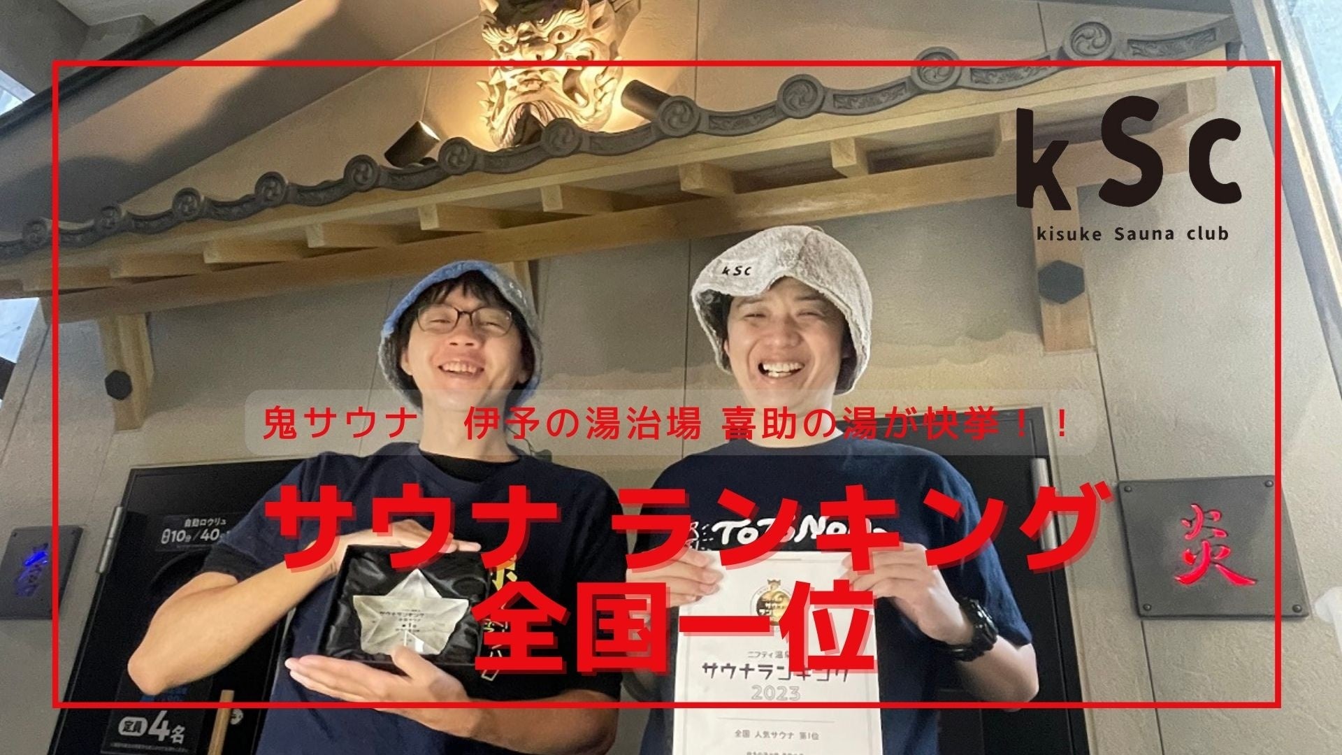 「伊予の湯治場 喜助の湯」「しまなみ温泉 喜助の湯」はともに近年、社内でサウナ開発を担う「-kisuke Sauna club-」が中心となってサウナの充実に力を入れてきました。数々の改善と新規サウナ開発を経て、このたびの「ニフティ温泉 サウナランキング2023」では「伊予の湯治場 喜助の湯」が栄誉ある全国第1位を受賞。「しまなみ温泉 喜助の湯」も第5位を獲得し、ダブル入賞となりました!