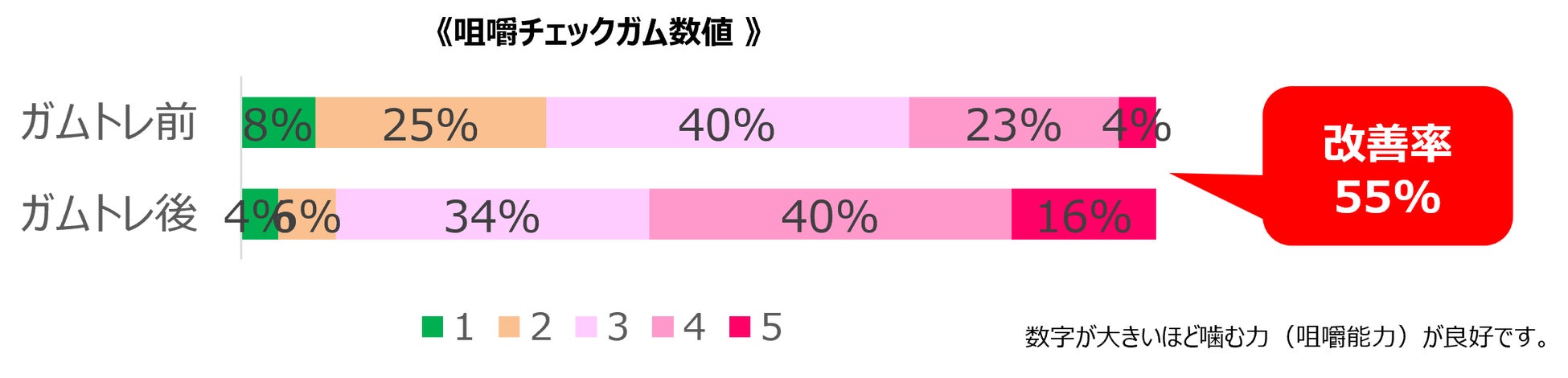 各園児に2か月間フーセンガムトレーニングを行ってもらい、トレーニング前後の「唾液の量」「咬み合わせの面積」「舌の力」「唇・舌・顎関節の運動機能」など複合的な因子で総合的に短時間で咀嚼能力を評価することができるキシリトール咀嚼チェックガム(※1)を用いて測定したところ、2か月のトレーニングによる改善率は55%(222名回答)という結果になりました。