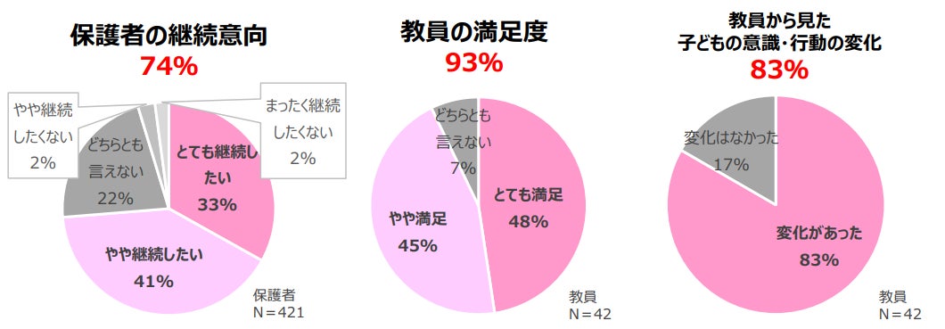 保護者と教員の双方から、効果を実感したり、意識や行動が変わったりと肯定的なコメントが多く集まり、高評価をいただきました。保護者に継続意向を聞いたところ、74%の方が、今後、フーセンガムを購入してトレーニングを継続したいと回答しました。また、教員の実施満足度が93%と非常に高く、園児の意識・行動の変化に対しても、83%が変化があったと回答しています。