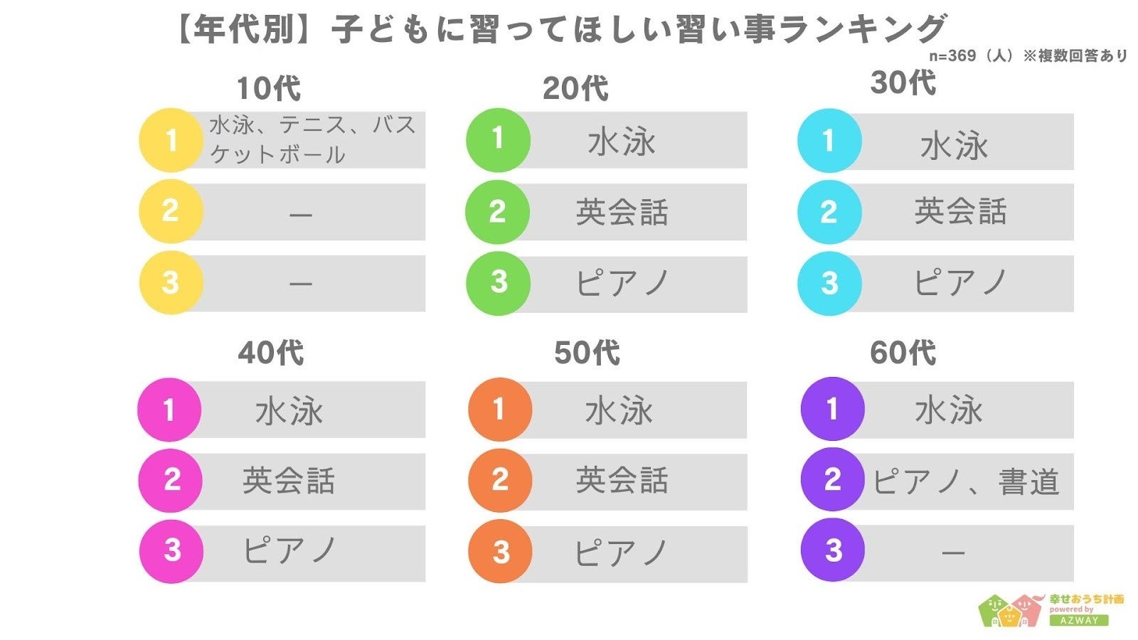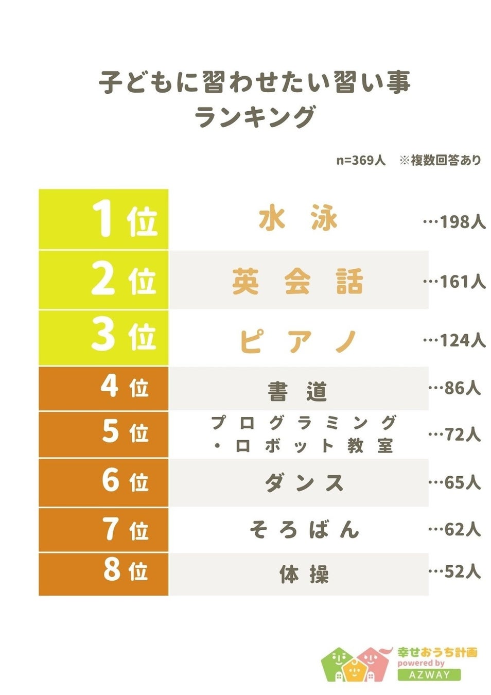 今回、株式会社AZWAY(https://azway.co.jp/)が運営する、幸せおうち計画(https://azway.co.jp/media/)は、10代から60代以上までの369人を対象に「子どもに習わせたい習い事ランキング」についてアンケート調査を実施しました。