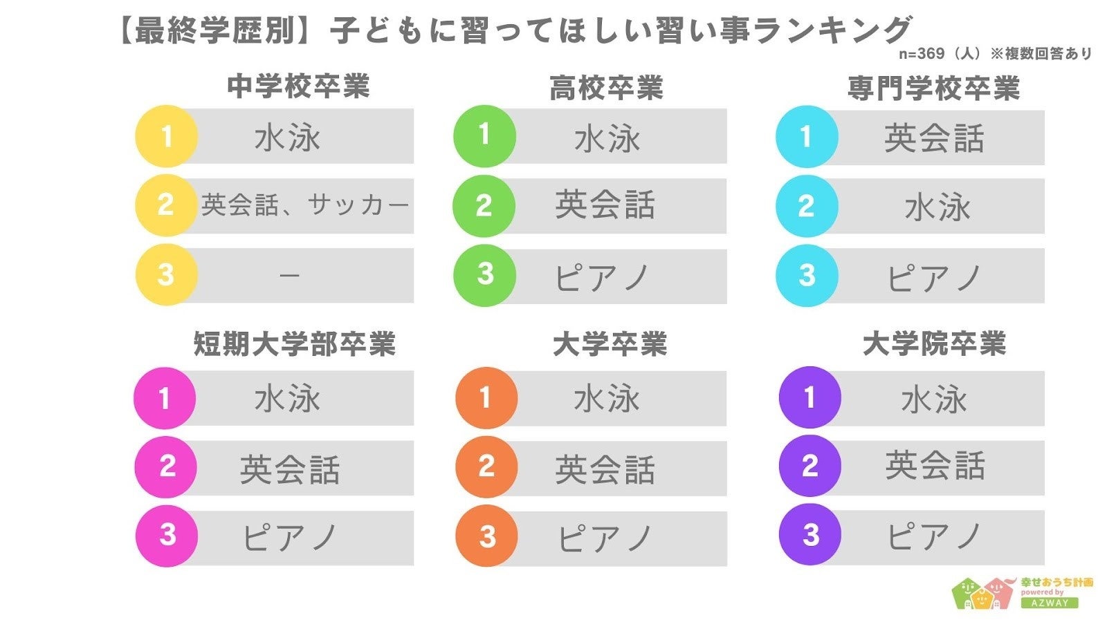 また、最終学歴別に「子どもに習わせたい習い事」について聞いたところ、中学校卒業を除いたどの学歴でも、順位に違いこそあれ水泳と英会話、ピアノの3つがランク入りしていることがわかります。一方、中学校卒業の人ではピアノの代わりに「サッカー」がランクイン。若干ではありますが、違いが現れています。