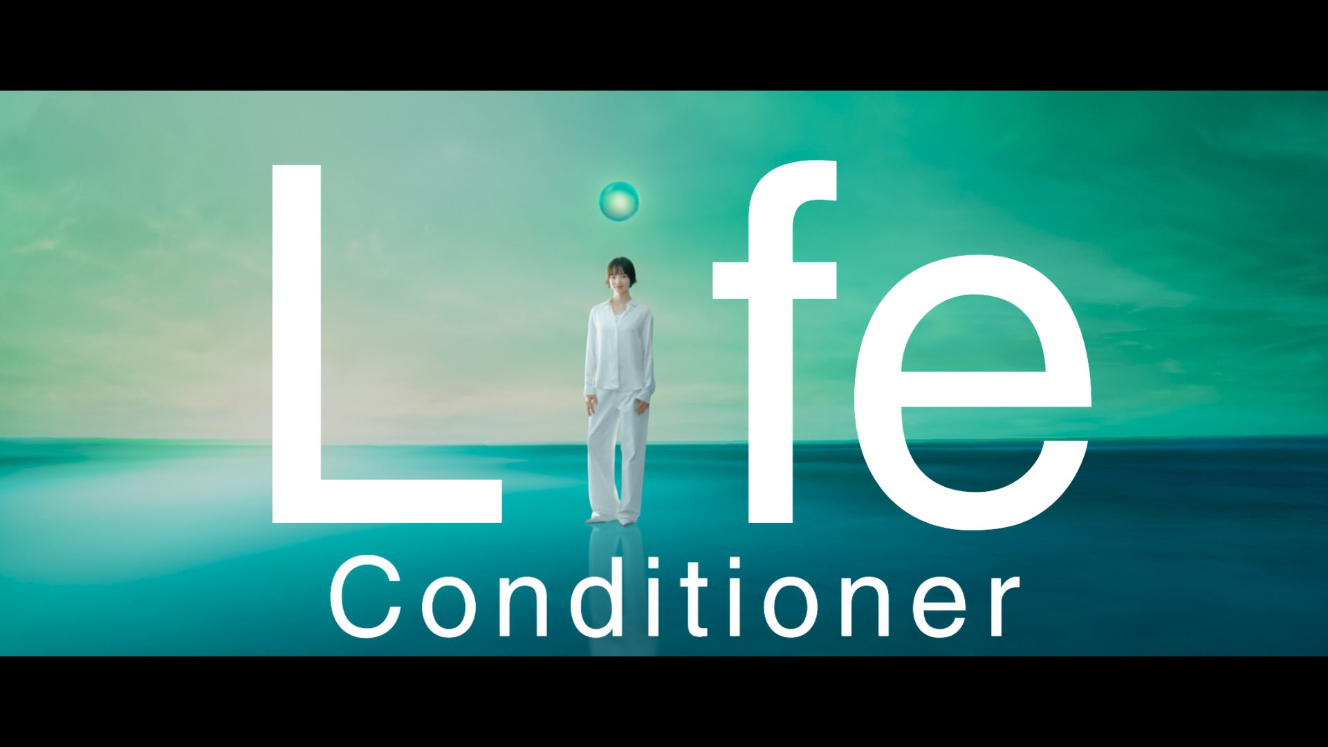 冒頭は、小松さんのフェイスアップとともに「ゼネラルは、Air Conditionerから、Life Conditionerへ。」というナレーションで始まります。小松さんを「i」に見立て、「Air」と「Life」の文字が切り替わる演出を通じてブランドの目指す姿を象徴的に表現しています。