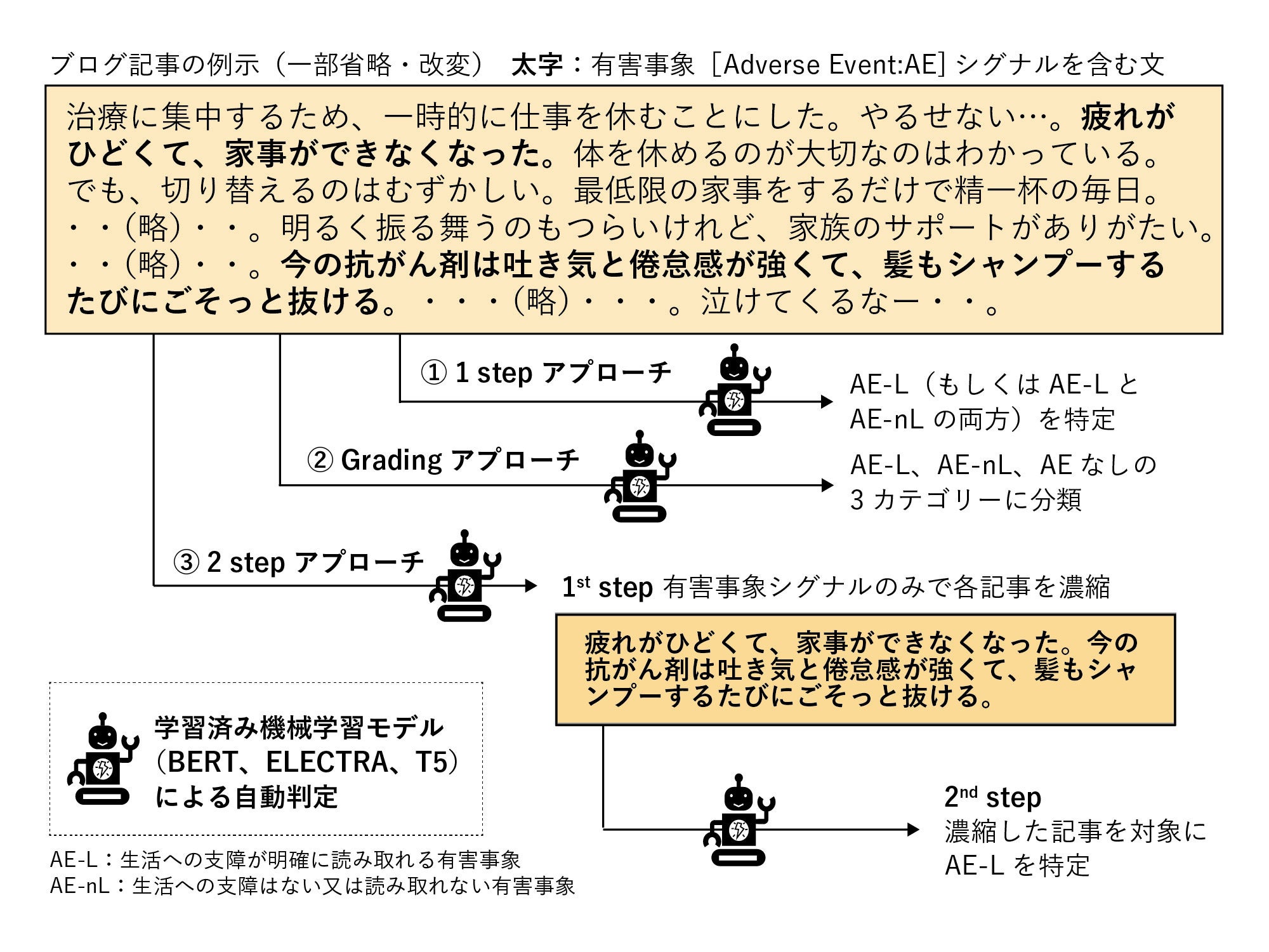 慶應義塾大学大学院薬学研究科博士課程3年の西岡諭史、同大学薬学部の堀里子教授らの研究グループは、奈良先端科学技術大学院大学の荒牧英治教授と共同で、患者がインターネット上のブログに投稿したテキスト(株式会社メディエイドより提供)から、深層学習を用いて、日常生活に支障を及ぼす重症度の高い事象に焦点を当てた有害事象シグナルの抽出手法を開発しました。この手法は、がん患者の副作用モニタリングの向上に資することが期待されます。本研究成果は、2023年9月19日に国際学術誌『Scientific Reports』電子版に掲載されました。