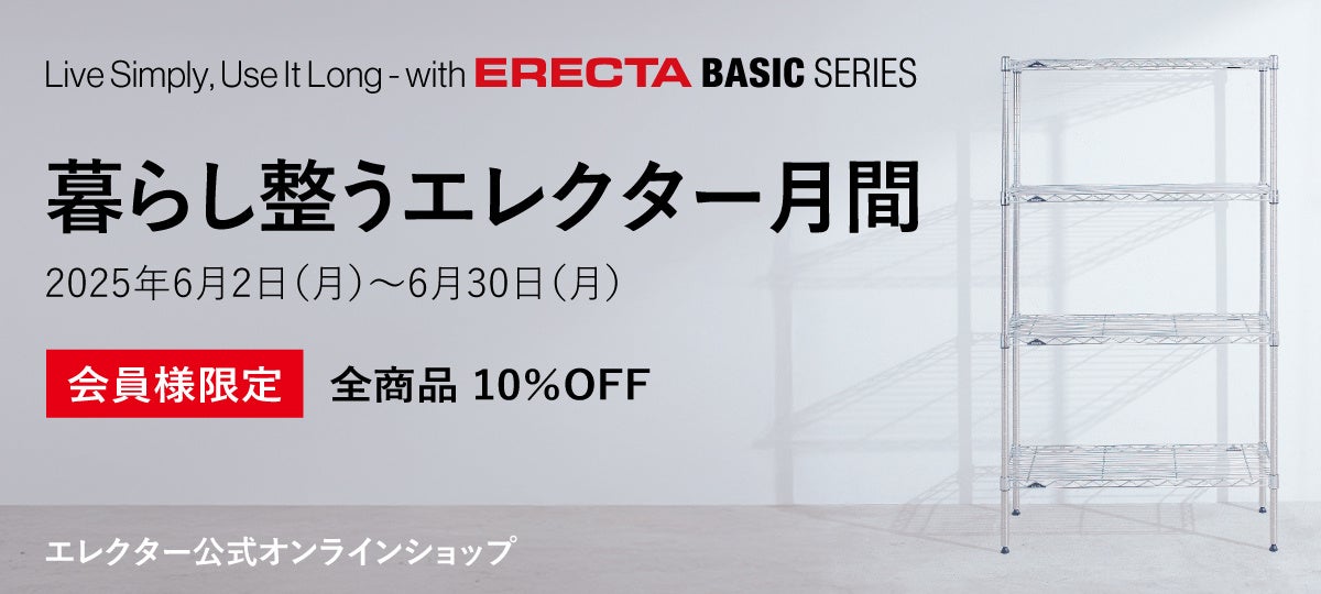 エレクター株式会社(本社:東京都目黒区、代表取締役社長:柳屋司)は、公式オンラインショップにて「暮らし整うエレクター月間」を開催しました。本キャンペーンでは、期間中にエレクターオンラインショップの会員の皆様に、全商品を10%OFFにてご提供いたします。
