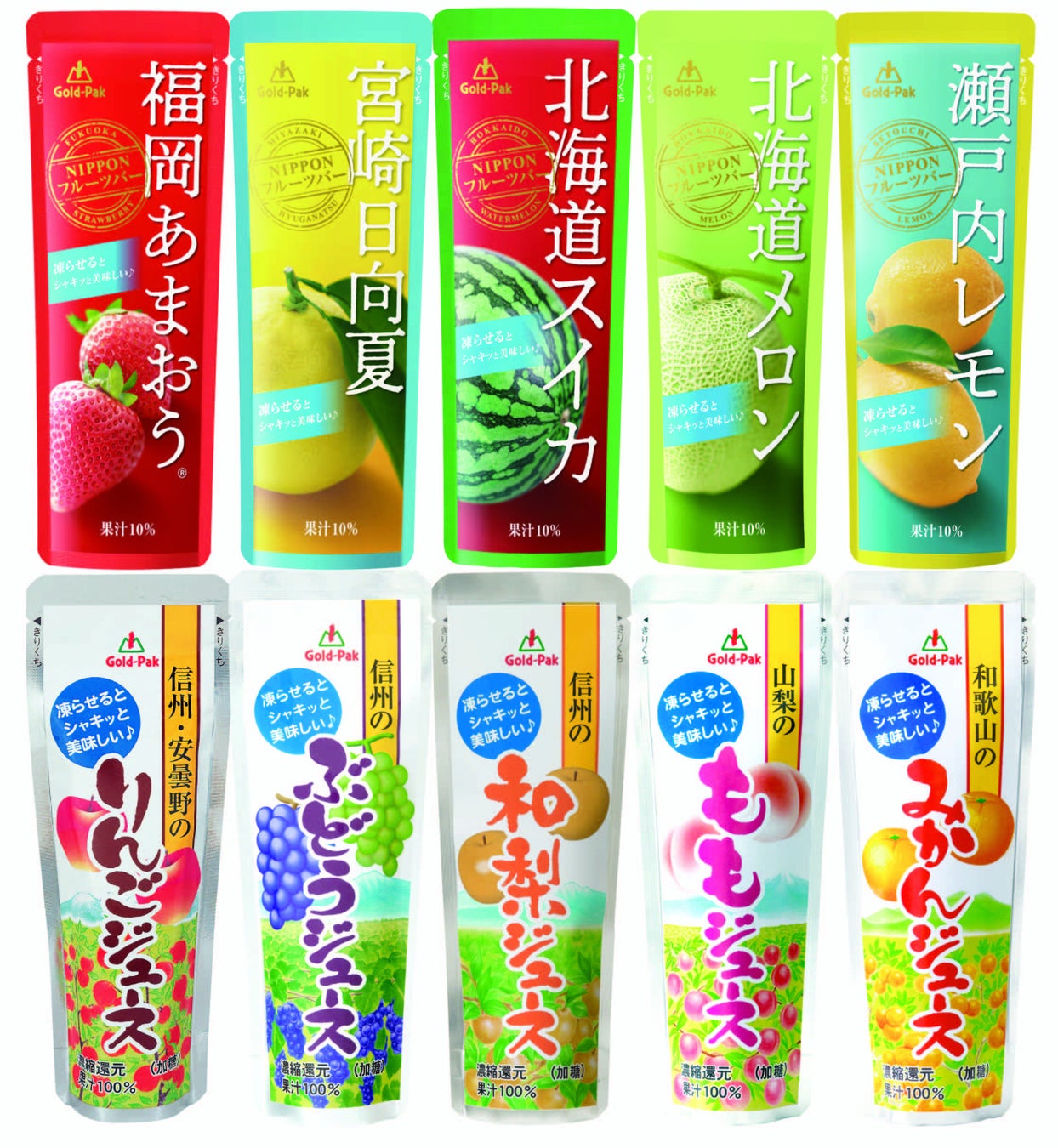 ゴールドパック㈱の大人気シリーズ、プレミアムな果実を使用した「NIPPONフルーツバー」「凍らせておいしい国産ジュース」を10本セットでお届けします。
