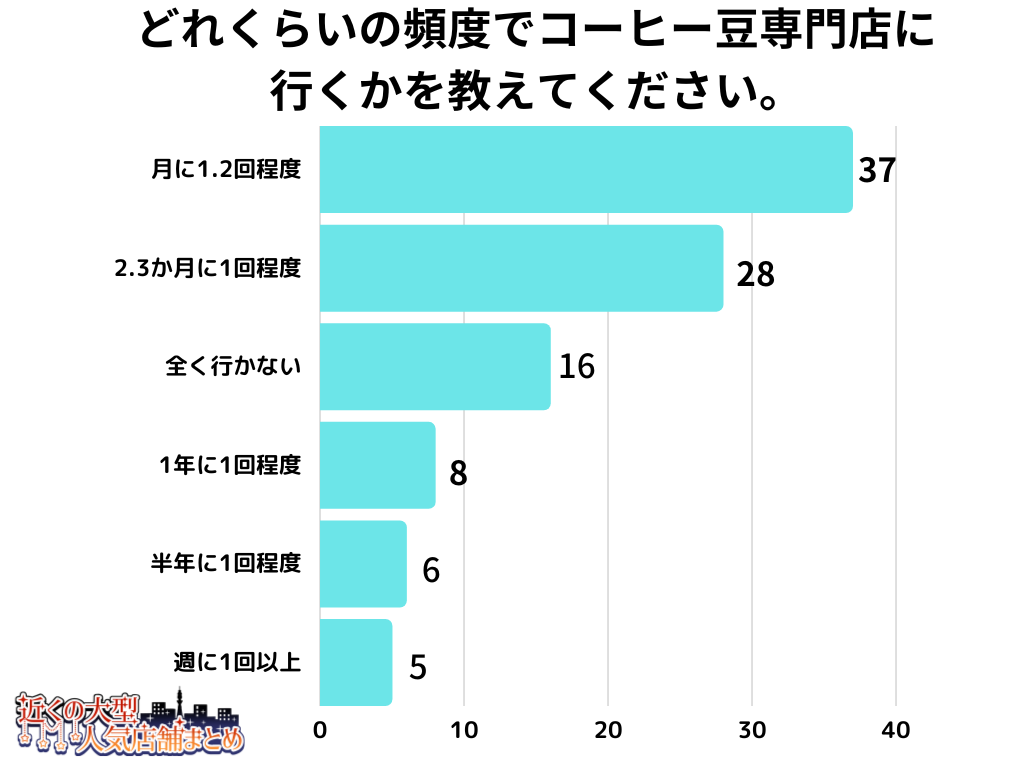 「どれくらいの頻度でコーヒー豆専門店に行くかを教えてください。」とアンケート調査した結果、1位は『月に1.2回程度』でした。