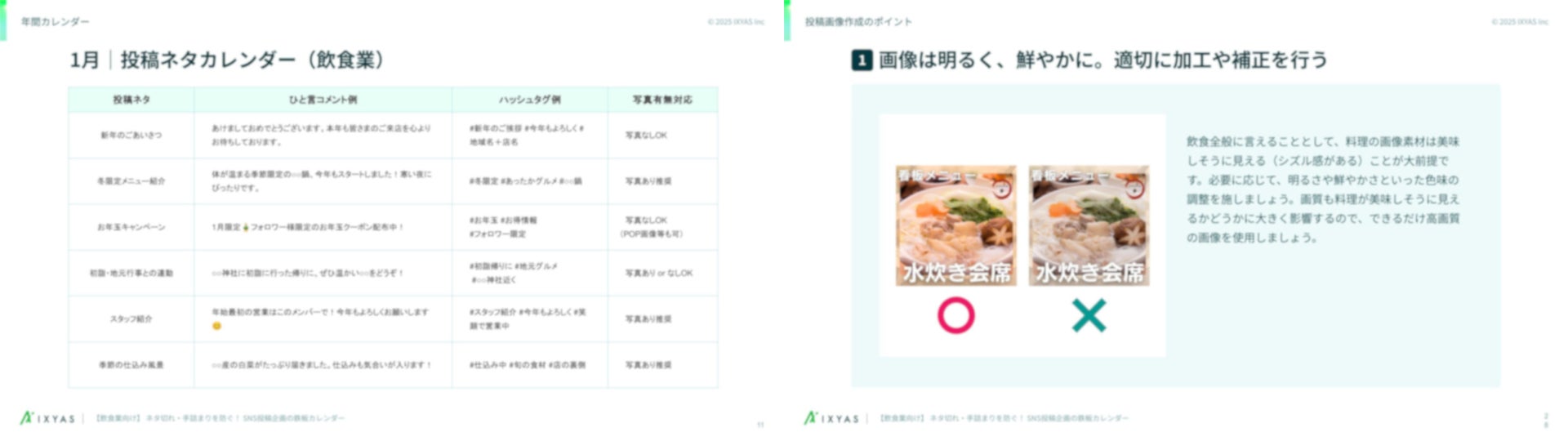 本資料は、SNSを活用した集客やファンづくりに課題を感じる飲食店の皆様に向け、1年間分の投稿ネタカレンダーをまとめております。季節感・販促・関係構築をバランスよく組み込み、週1~2回の投稿を無理なく継続できるよう設計しました。さらに、弊社がこれまで数多くのクライアント支援を通じて蓄積した現場の経験則と、実運用データに基づく定量的知見を掛け合わせて「効果を最大化する画像作成の注意点」を整理し、再現性の高いノウハウとしてご紹介しています。