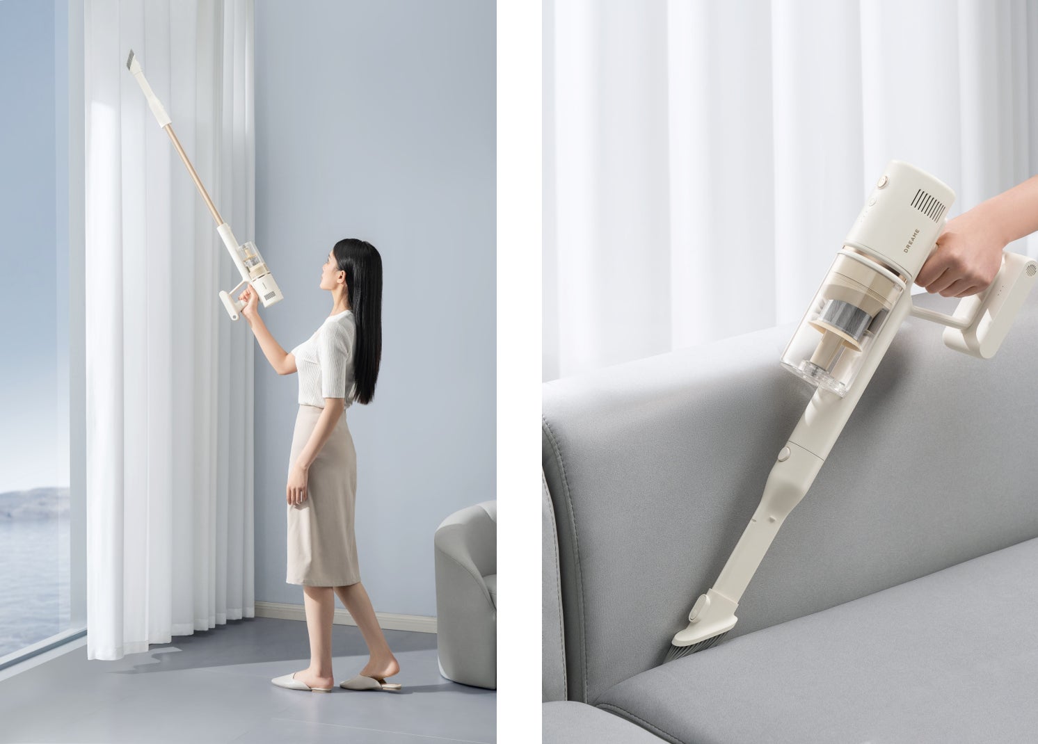 「CleanX U8」は100AW※10のパワーで連続吸引し、頑固な汚れや髪の毛、ペットの毛などをキレイに掃除します。また、日本の住環境に最適化し、性能は従来のままに、わずか1.28kgの軽量ボディを実現しました。取り外しも楽々でき、延長バイブやコンビネーションツールにより、家具の上や天井近くのほこり、目や手の届きづらい奥まった隙間まで、片手でストレスなくきれいに掃除できます。