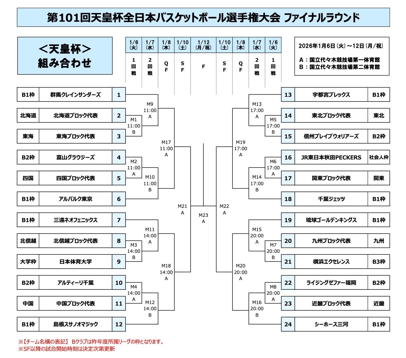 第101回 天皇杯 全日本バスケットボール選手権大会ファイナルラウンドの概要が発表され、群馬クレインサンダーズは2026年 1月7日(水)に国立代々木競技場第一体育館にて、北海道ブロック代表 vs 東海ブロック代表の勝者と対戦することが決定しましたのでお知らせいたします。
