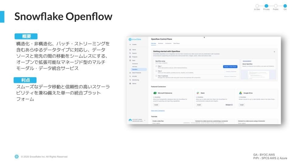 ■Snowflake Openflow、データの完全な相互運用性を確保し、 AIイノベーションを加速するデータ移動を可能に:Snowflakeはデータ移動に変革をもたらすSnowflake Openflowを発表しました。これはマルチモーダルのデータ取り込みサービスで、ユーザーは実質的にあらゆるデータソースへの容易な接続を実現し、あらゆるデータアーキテクチャから価値を引き出すことができます。Snowflake Openflowは、データの統合や相互運用性に対するSnowflakeの取り組みを示すものであり、あらかじめ構築された拡張可能なコネクタを活用することで、世界中の数千社にのぼる顧客が、自社のエンタープライズデータエコシステム全体を、Snowflake上でAIモデル、アプリケーション、データエージェントと直接連携させることが可能になります。Snowflake Openflowは、断片化されたデータスタックと、データチームが取り込み作業に費やしてきた膨大な手作業を排除し、データ移動をシームレスにします。
