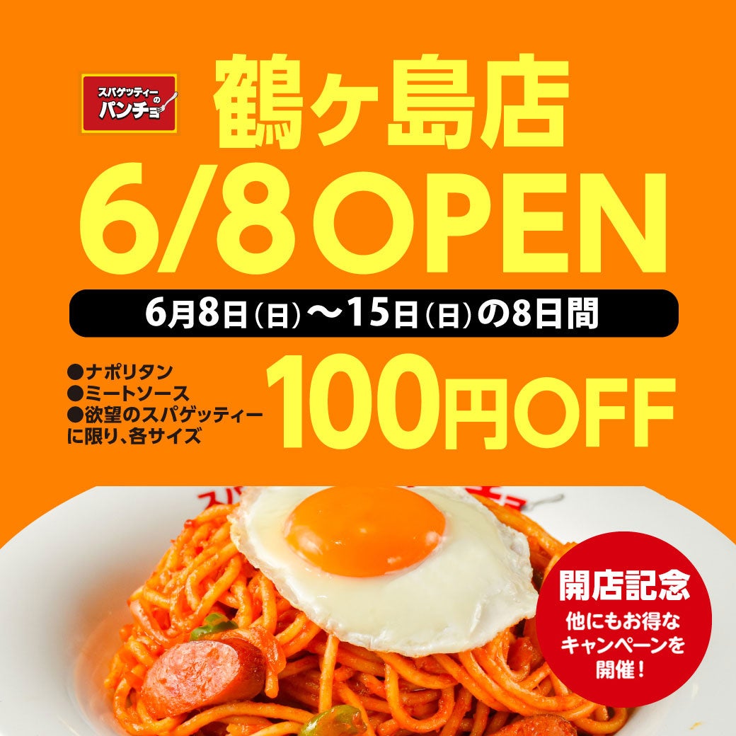 この度、鶴ヶ島店の新規開店を記念しオープン当日6月8日(日)から6月末まで4つのキャンペーンを開催します。第一弾は6月8日(日)から3日間、各日先着30名様にノベルティーをプレゼント。第二弾は6月15日(日)まで、ナポリタン・ミートソース・欲望のスパゲッティーの各サイズ100円OFF。第三弾は6月22日(日)まで、お食事の方に鶴ヶ島店限定トッピング定期券(1回1品/240円商品まで・有効期限8月末)を進呈。そして第四弾は6月30日(月)までにパンチョ公式アプリで鶴ヶ島店をお気に入り登録の方に、トッピング「王道セット」クーポン(有効期限7月末)を配信します。
