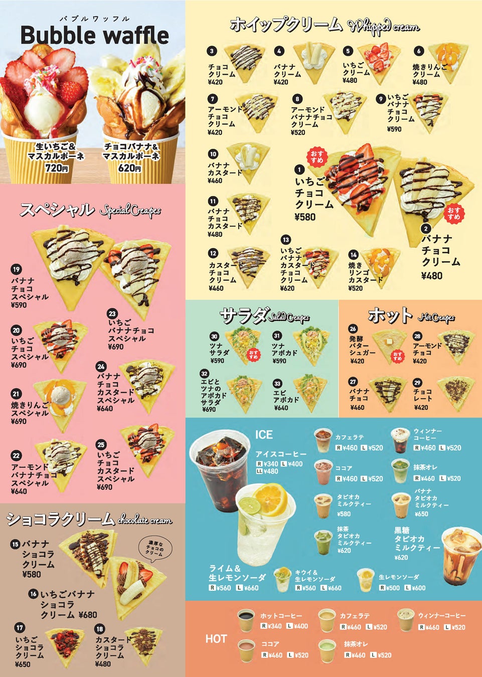 「スパゲッティーのパンチョ 鶴ヶ島店」に併設のコーヒー&クレープ専門店。珈琲焙煎士が監修するオリジナルブレンドコーヒーをはじめカフェラテ、ウィンナーコーヒー、ココア、抹茶オレ、タピオカミルクティー、フレッシュレモンソーダ、季節限定ドリンクなどをご用意。クレープは気軽に楽しめる420円(税込)からのスペシャルプライスで、クリームのデザートやフルーツ系からツナ・エビ・アボカドのサラダ系まで30種以上をラインナップしています。