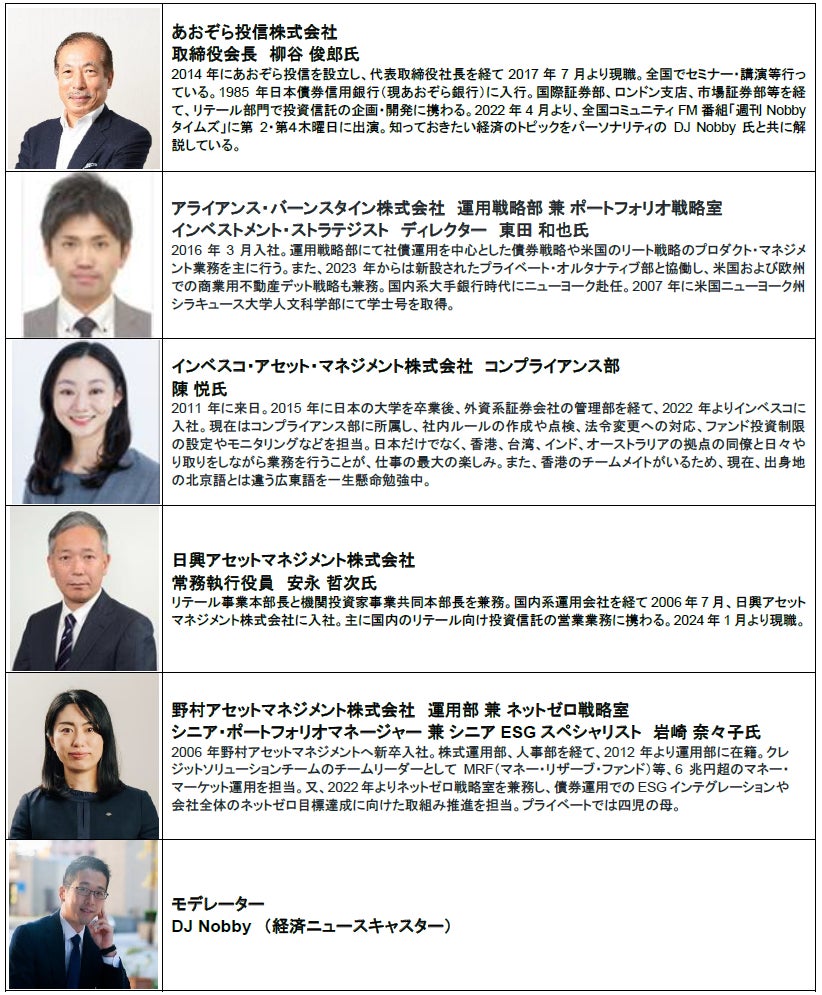 主催企業5社(あおぞら投信株式会社、アライアンス・バーンスタイン株式会社、インベスコ・アセット・マネジメント株式会社、日興アセットマネジメント株式会社、野村アセットマネジメント株式会社)にて、お預かりする個人情報を本イベントの円滑な運営(参加日や場所のご案内等)のために共同で利用させていただきます。