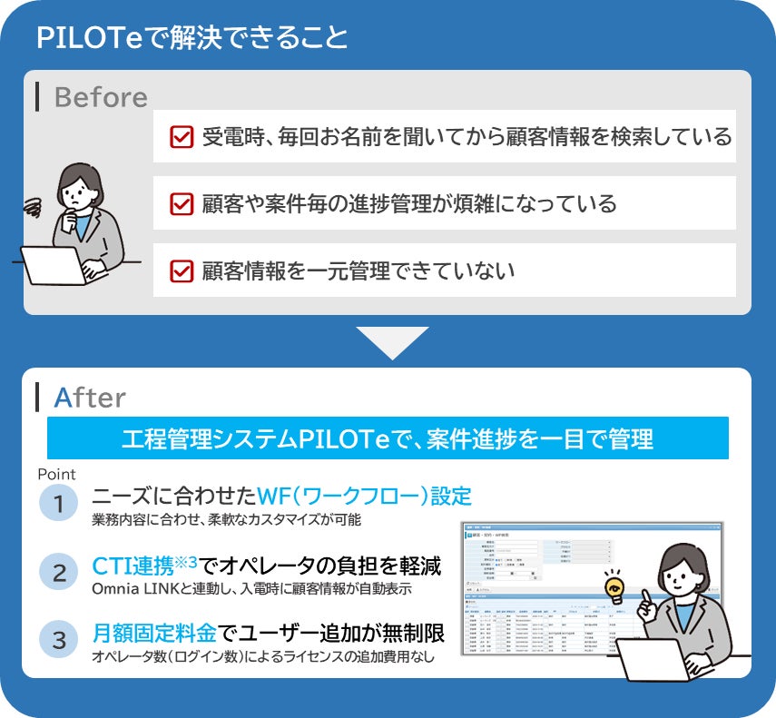 「Omnia LINK PILOTe」は、ビーウィズが提供するコンタクトセンター統合システム「Omnia LINK」の損保業界特化型CRM※1です。これまでの損害保険業務の受託ノウハウを活かし、保険更新業務の工程管理に特化した機能を備えています。PBX※2との連携や、生産性の可視化、満期日から逆算したワークフロー作成機能などを通じて、保険更新業務を包括的に支援し、生産性向上を実現します。