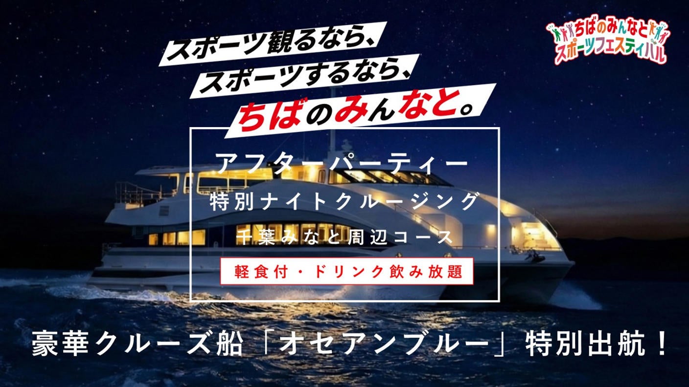 3/28(土)に千葉みなとで開催される「ちばのみんなとスポーツフェスティバル」終了後のアフターパーティーとして、ちばみなとエリアを豪華クルーズ船「オセアンブルー」でめぐる特別ナイトクルージングを開催!千葉みなとのサンセットや工場夜景を楽しめます。