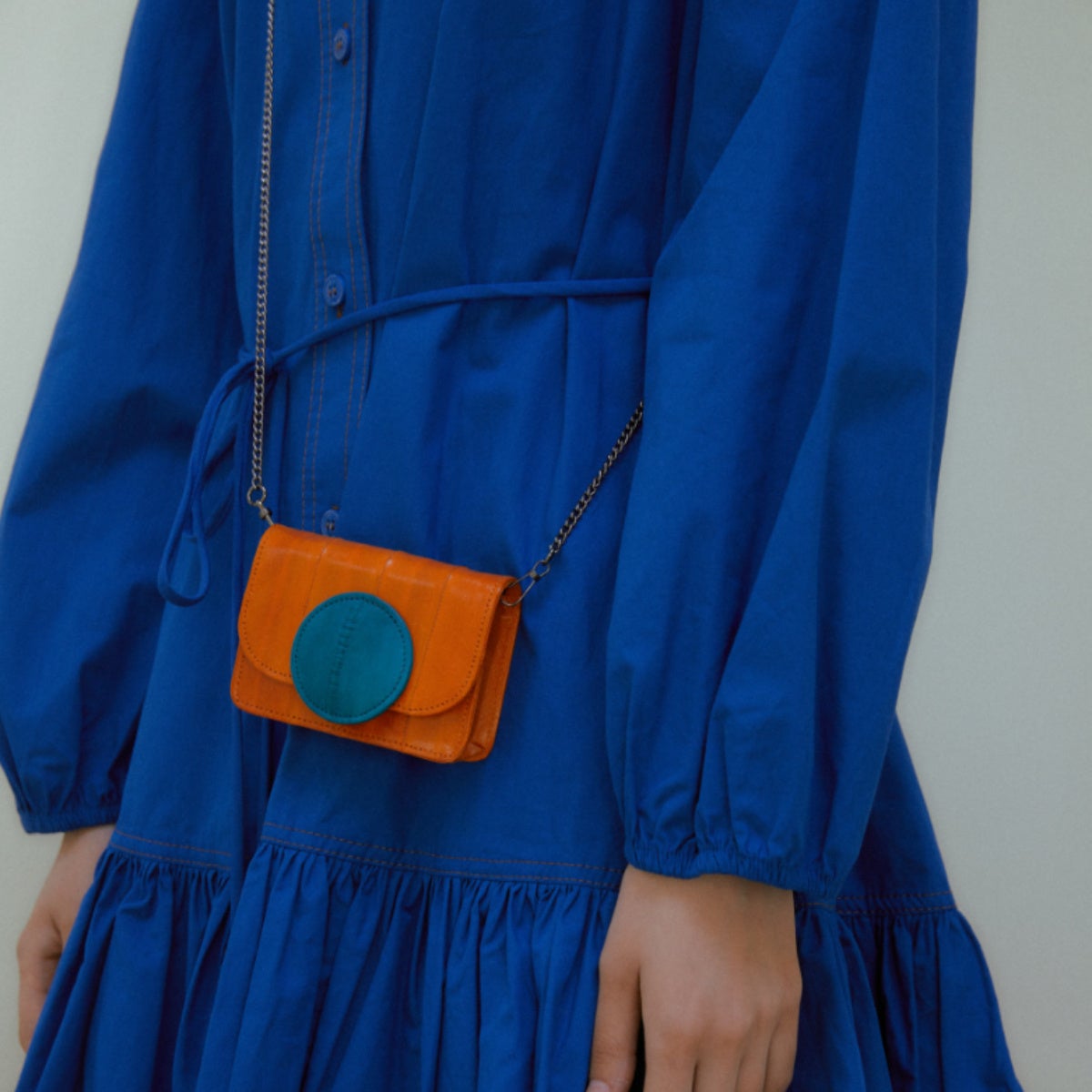 マカロンのような丸いポイントが可愛いウォレット兼ミニバッグです。このマカロンには少しのボリュームをもたせています。メタルチェーンストラップが付属。ストラップを付けて着用すると、コーディネートのアクセントにもピッタリなミニバッグになります。