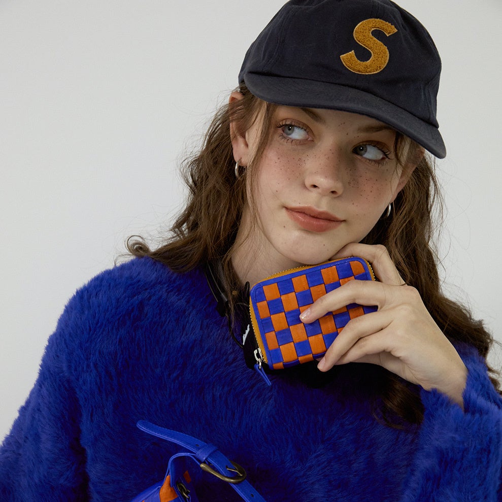 ひとつひとつ手作業で作られたブロックチェックがポイントのカードウォレットです。中央のファスナーポケットにはコインを収納できます。カラフルな色の組み合わせが気分を高めてくれます。