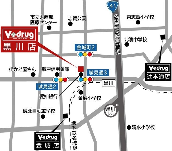 V・drug 黒川店は、地下鉄名城線「黒川」駅から北西約0.4㎞の住宅街に位置します。