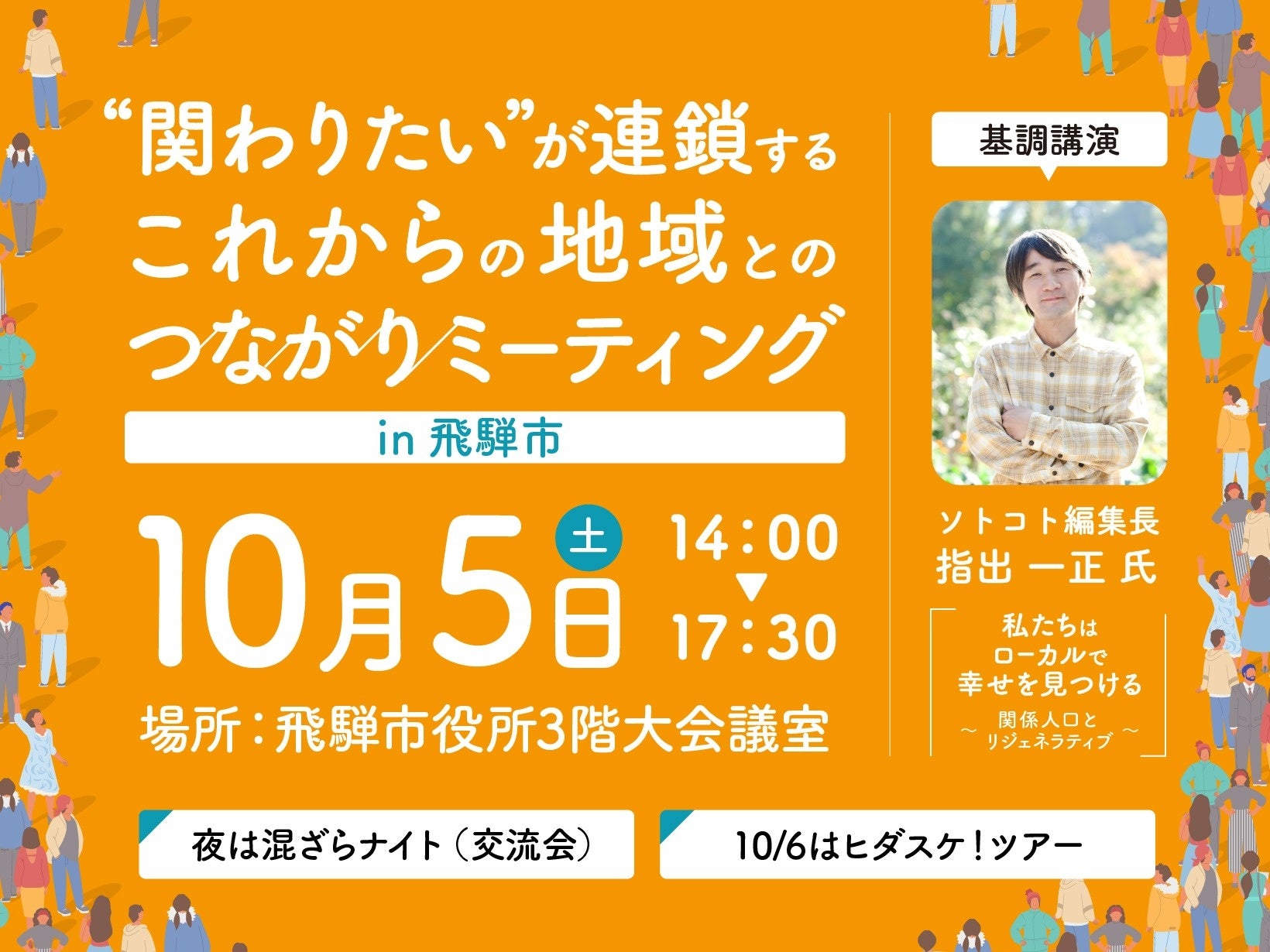 今回、飛騨市から「関係人口」との共創の面白さを発信するととともに、未来をつくるSDGsマガジン「ソトコト」編集長の指出一正氏をお招きし、「関係人口×地域」をテーマにした探究イベントを10月5日(土)に開催します。「関係人口」を切り口にゲストや参加者同士で情報交換・交流する場です。現在参加者募集中です。視察にもおすすめです!