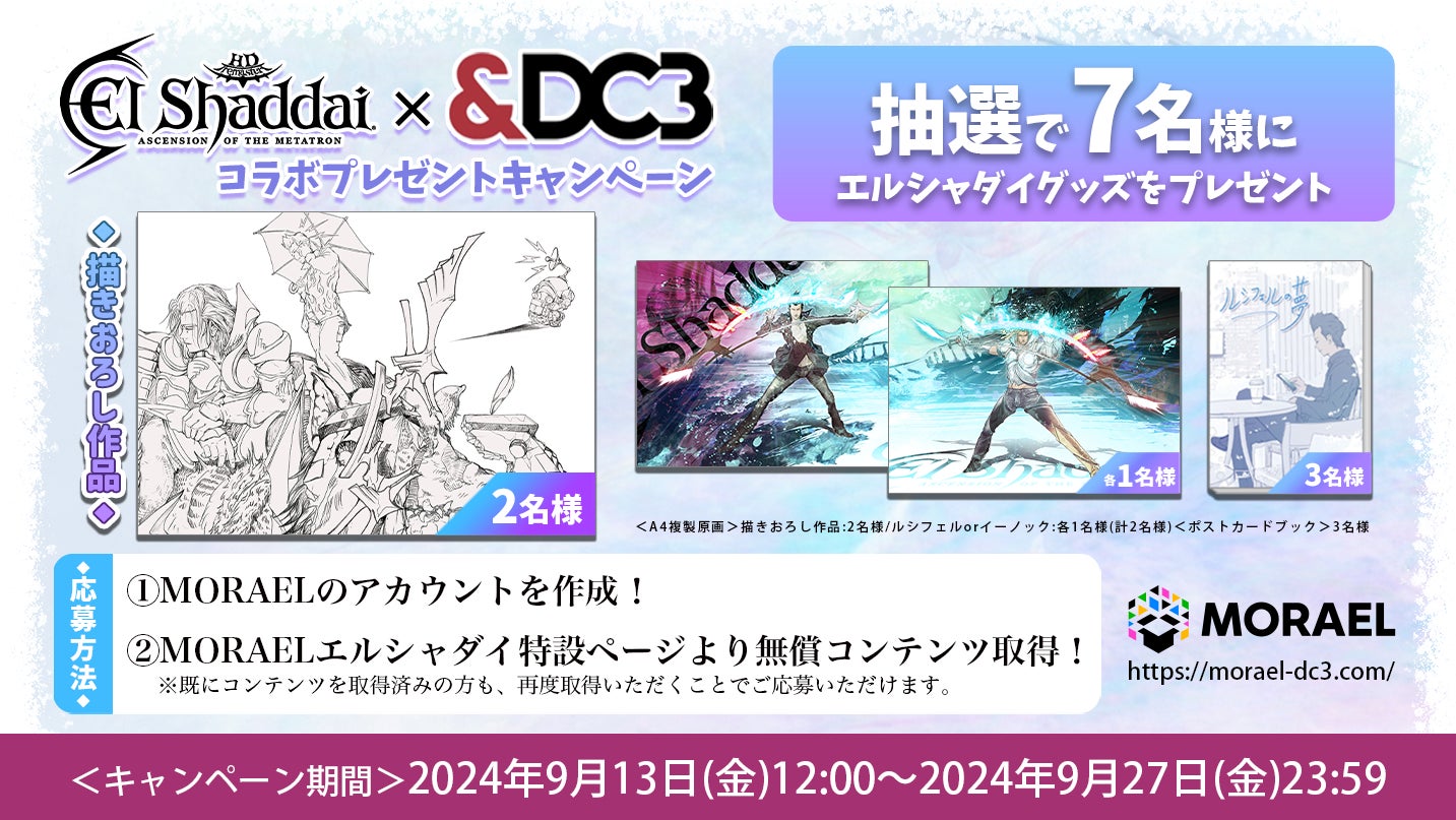 さらに、サイン入りDC3コンテンツの販売開始を記念して、「MORAEL」上で配布しているエルシャダイコンテンツを獲得することで応募できるエルシャダイグッズのプレゼントキャンペーンを実施いたします。