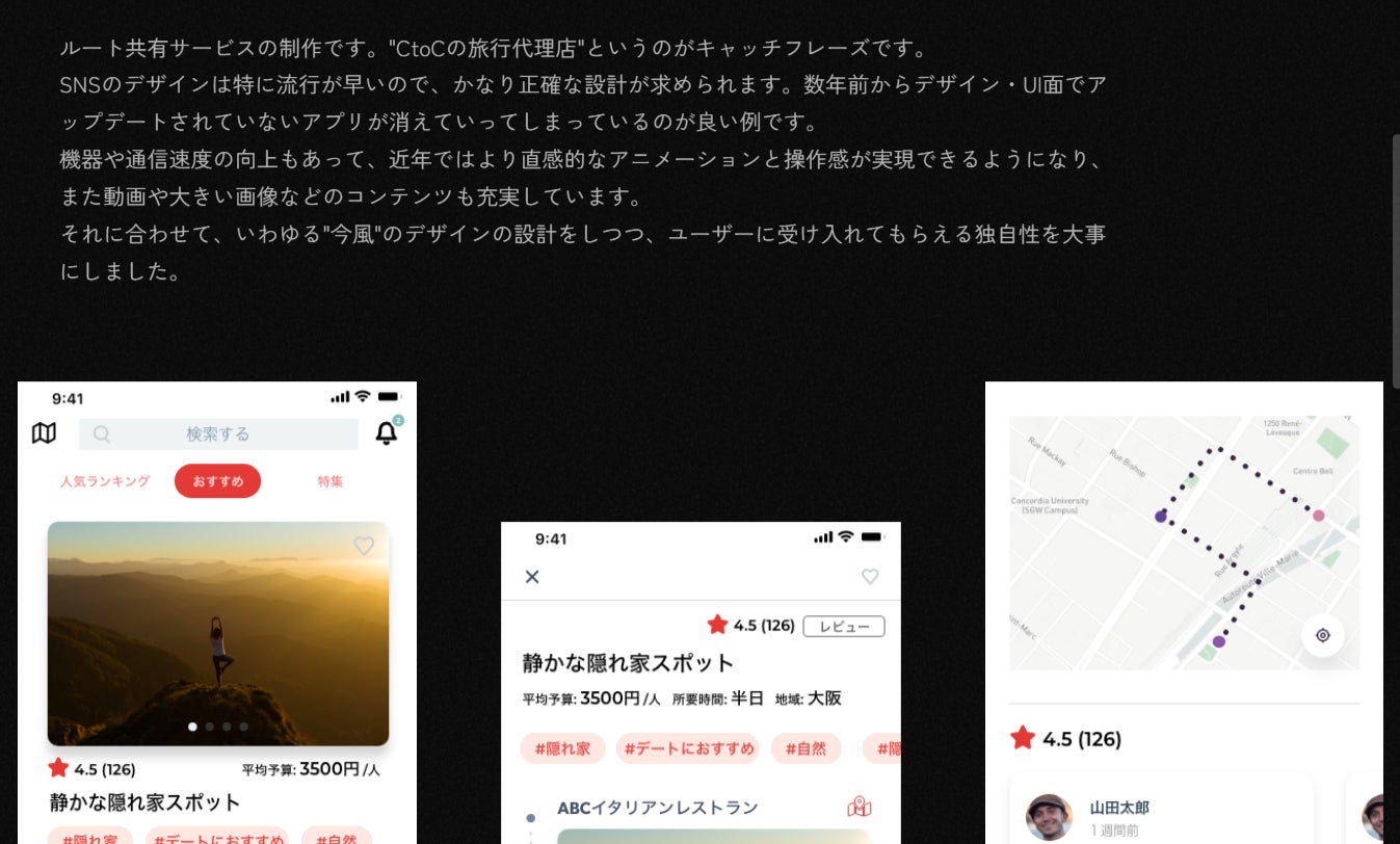 UI/UXデザイン 全てのクライアントプロジェクトにおいて、ユーザー中心設計(UCD)のアプローチを採用しています。綿密なユーザーリサーチと反復的なデザインプロセスにより、機能性と美しさを兼ね備えたインターフェースを創出しています。