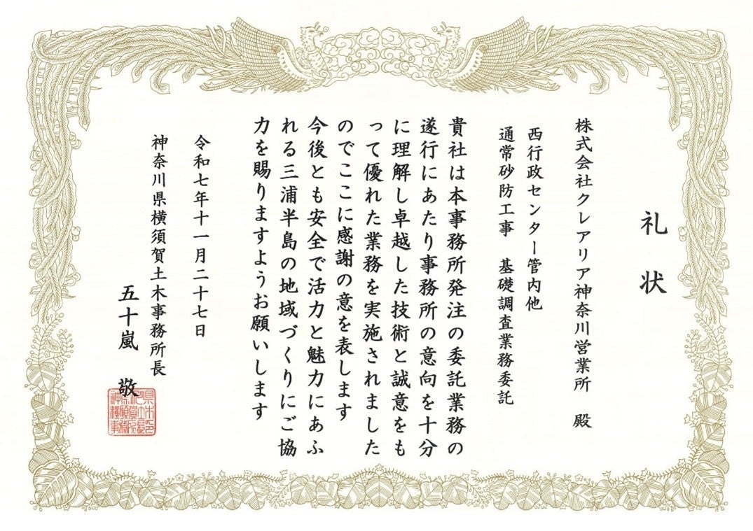 当社連結子会社である株式会社クレアリアは、神奈川県横須賀土木事務所が発注した業務において、その成果が極めて優秀であり、他の模範となるものと認められ、同事務所長より「礼状(優良設計業務委託等の顕彰)」を授与されましたのでお知らせいたします。