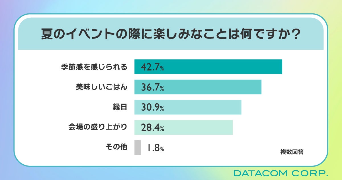夏のイベントの際に楽しみなことについては、「季節感を感じられる」が最多の42.7%となりました。前述の「花火」や「祭り」が上位にランクインしていたことからも、イベントの魅力として、季節特有の雰囲気や体験からくる季節感を挙げる人が多いのも頷けます。また、「美味しいごはん」や「縁日」については屋台で提供されるイベントならではの食事や遊びを楽しみにしている人が多くいると考えられます。