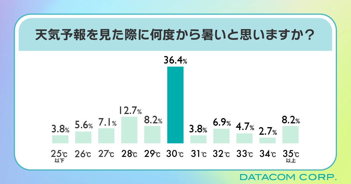 天気予報を見た際に暑いと感じる気温について尋ねたところ、3分の1以上が「30℃」と回答しました。一般的に30℃以上が真夏日と定義される事もあり、30℃を超えると暑いと認識する人が多いようです。また、熱中症についても30℃を超えると救急搬送が多くなるというデータもあり、暑さを感じ始める基準が30℃という認識はあながち間違いではないと考えられます。