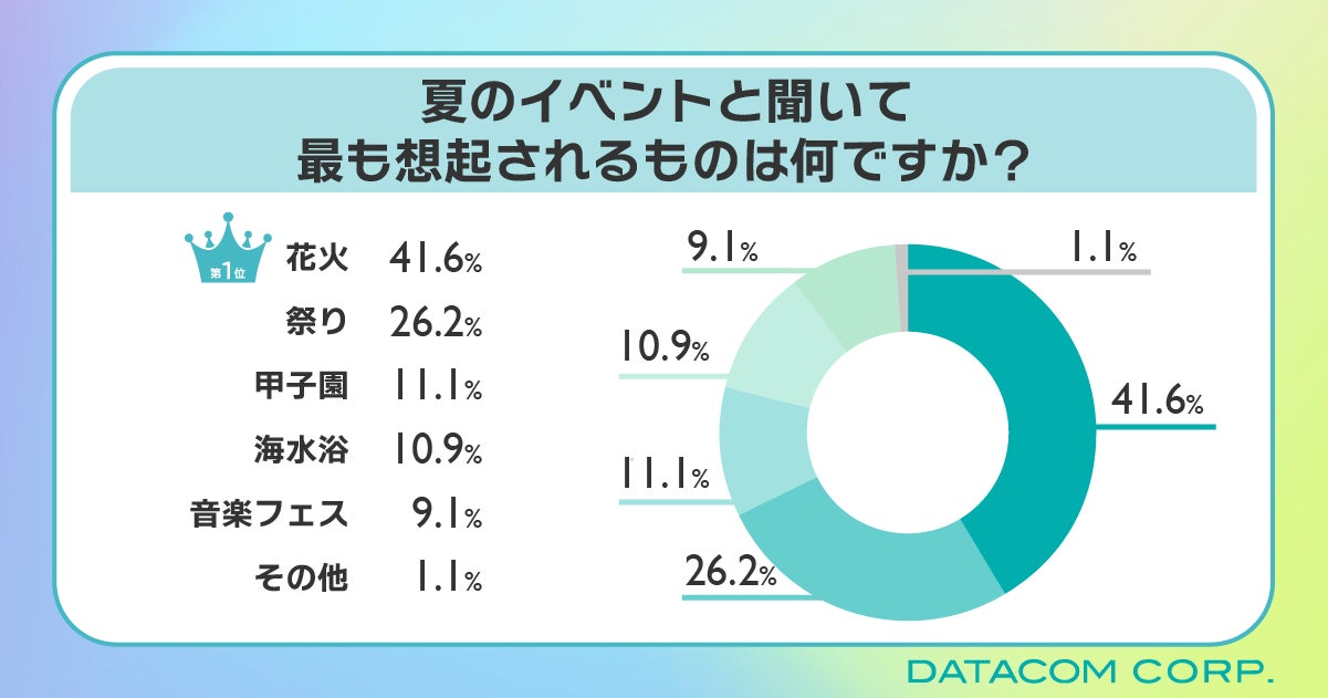 夏のイベントと聞いて想起されるものを尋ねたところ、「花火」が全体の41.6%と最も多くの人に想起される結果になりました。次いで、「祭り」が26.2%と伝統的であり夏の風物詩として良く語られるイベントが強く認識されていると考えられます。一方で、「甲子園」や「音楽フェス」等の特定の趣味に関するイベントであっても一定数、夏のイベントとして想起するひとはいるようです。