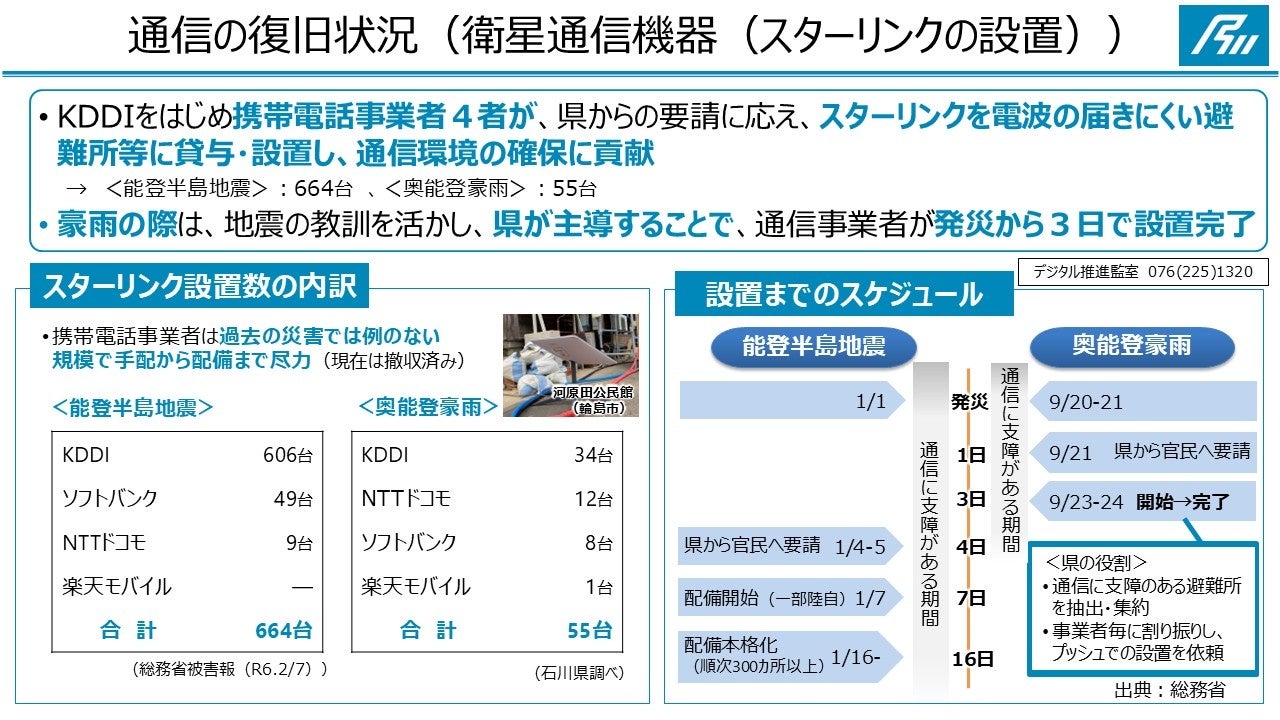 地震及び豪雨では、KDDIをはじめとする 携帯電話事業者4者が、石川県からの要請に応え、衛星通信機器であるスターリンクを電波の届きにくい避難所等に貸与・設置し、通信環境の確保に貢献いただきました。