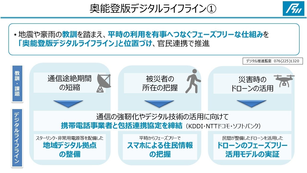 地震や豪雨で得られた通信途絶への対応や災害時のデジタル技術の活用に向けた教訓を踏まえ、平時の利用を有事へつなぐフェーズフリーな取組を、「奥能登版デジタルライフライン」として位置づけて、官民連携で推進することとしました。