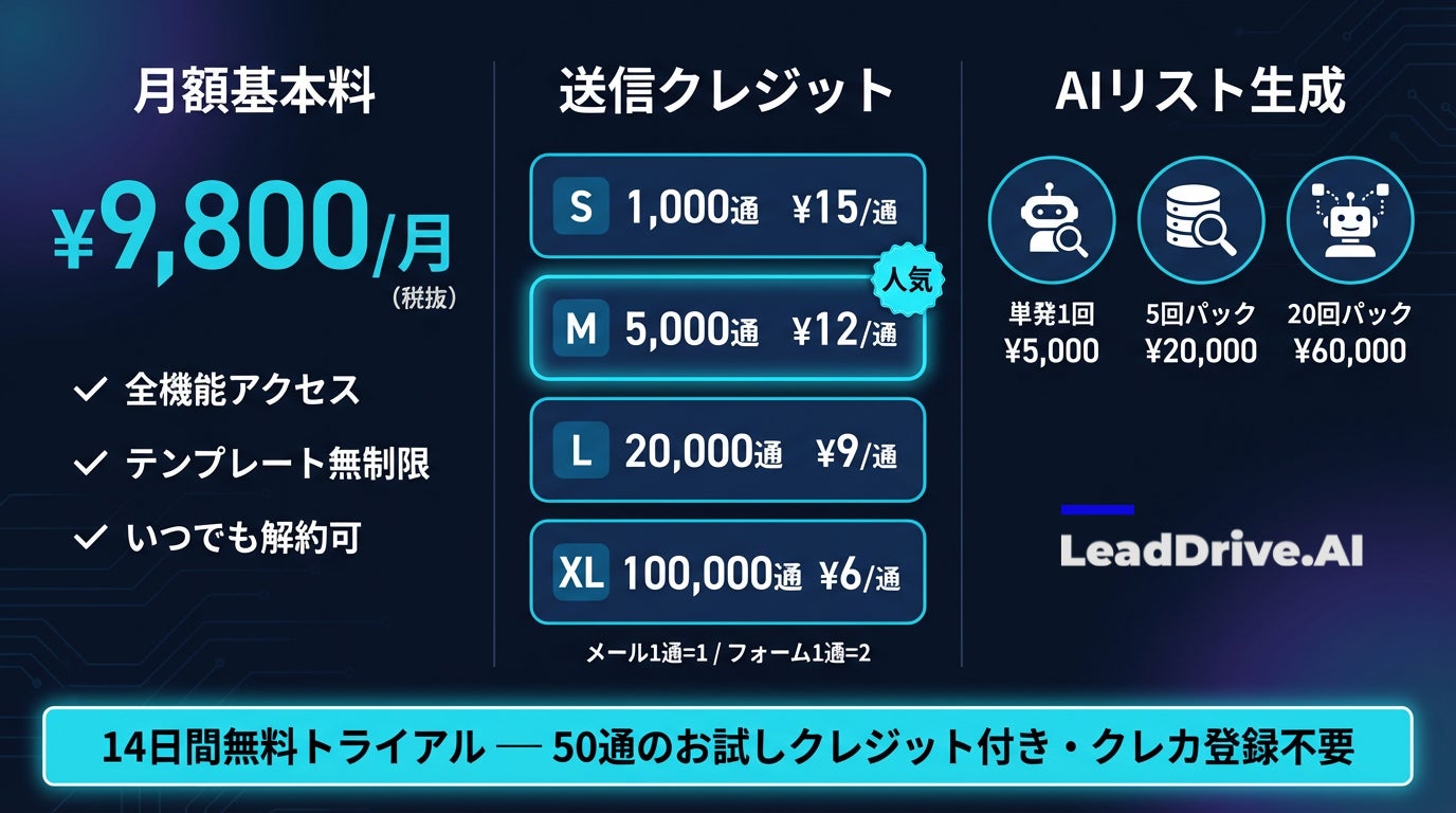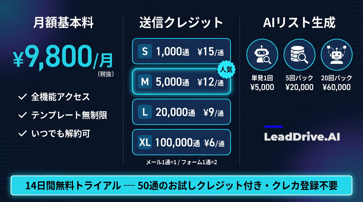 AI営業自動化SaaS「LeadDrive.AI」が料金を全面刷新。月額9,800円・契約縛りなし・使った分だけの従量制で、導入ハードルを業界最低水準に