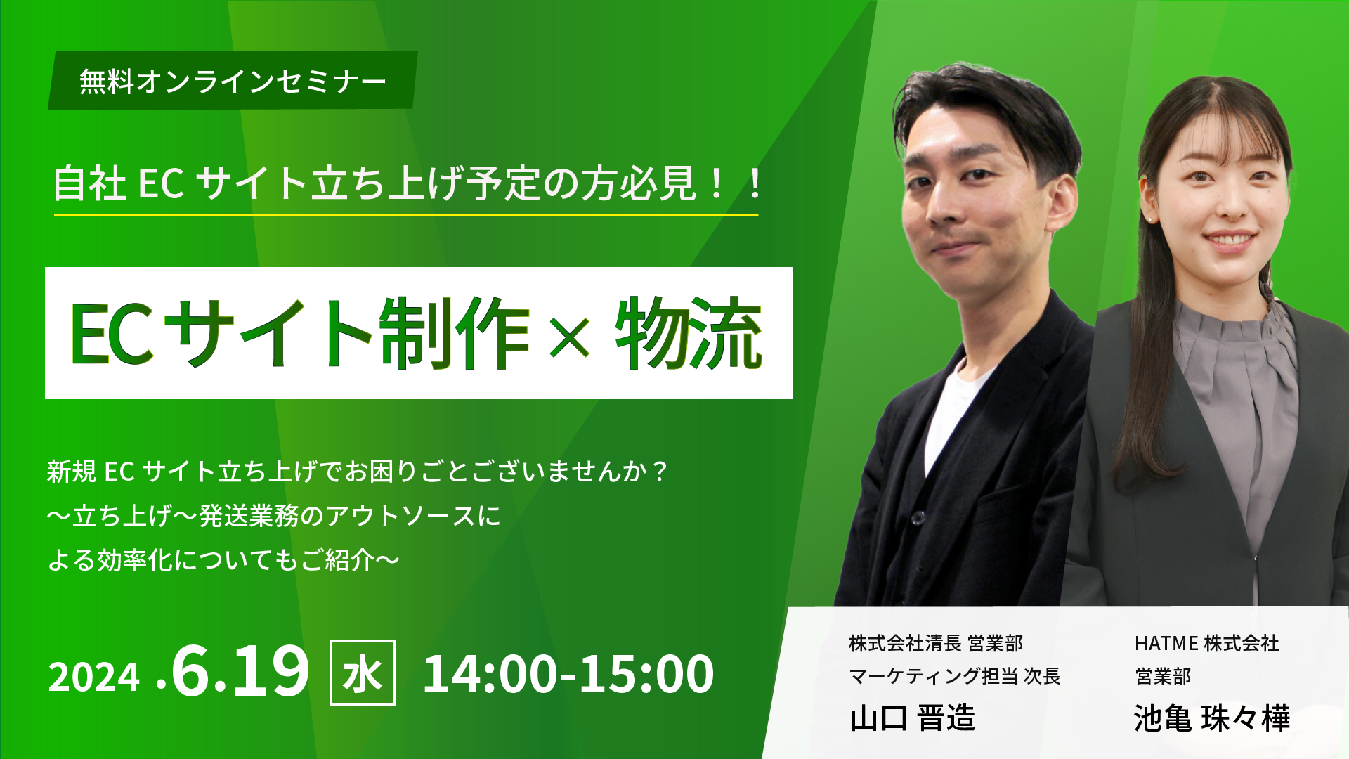 マーケティングアソシエーション株式会社の子会社であるHATME株式会社(本社:東京都台東区 代表取締役:中園広和、以下当社)は2024年6月19日(水)に、ウェブセミナー「新規ECサイト立ち上げでお困りごとございませんか? ~立ち上げ~発送業務のアウトソースによる効率化についてもご紹介~」を、株式会社清長様と共催いたします。