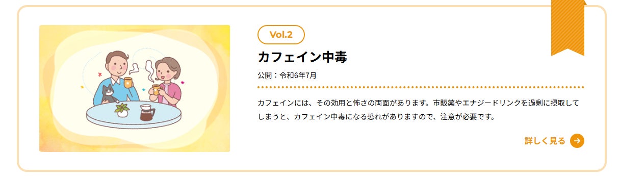 また、注目すべき事項として、カフェインを含んだ市販薬についても触れ、1錠当たり100mgのカフェインを含んでいるわが国で一番人気のある眠気・だるさ防止薬は容易に入手できるにも関わらず、10~30錠以上を服用してしまうと中毒になる危険性があることを紹介。カフェインを高濃度に含んでいる市販薬は、容易に「毒」に化ける可能性があるとして、短時間に摂り過ぎないように、適度な量を適度な間隔をあけて摂取するよう呼び掛けています。