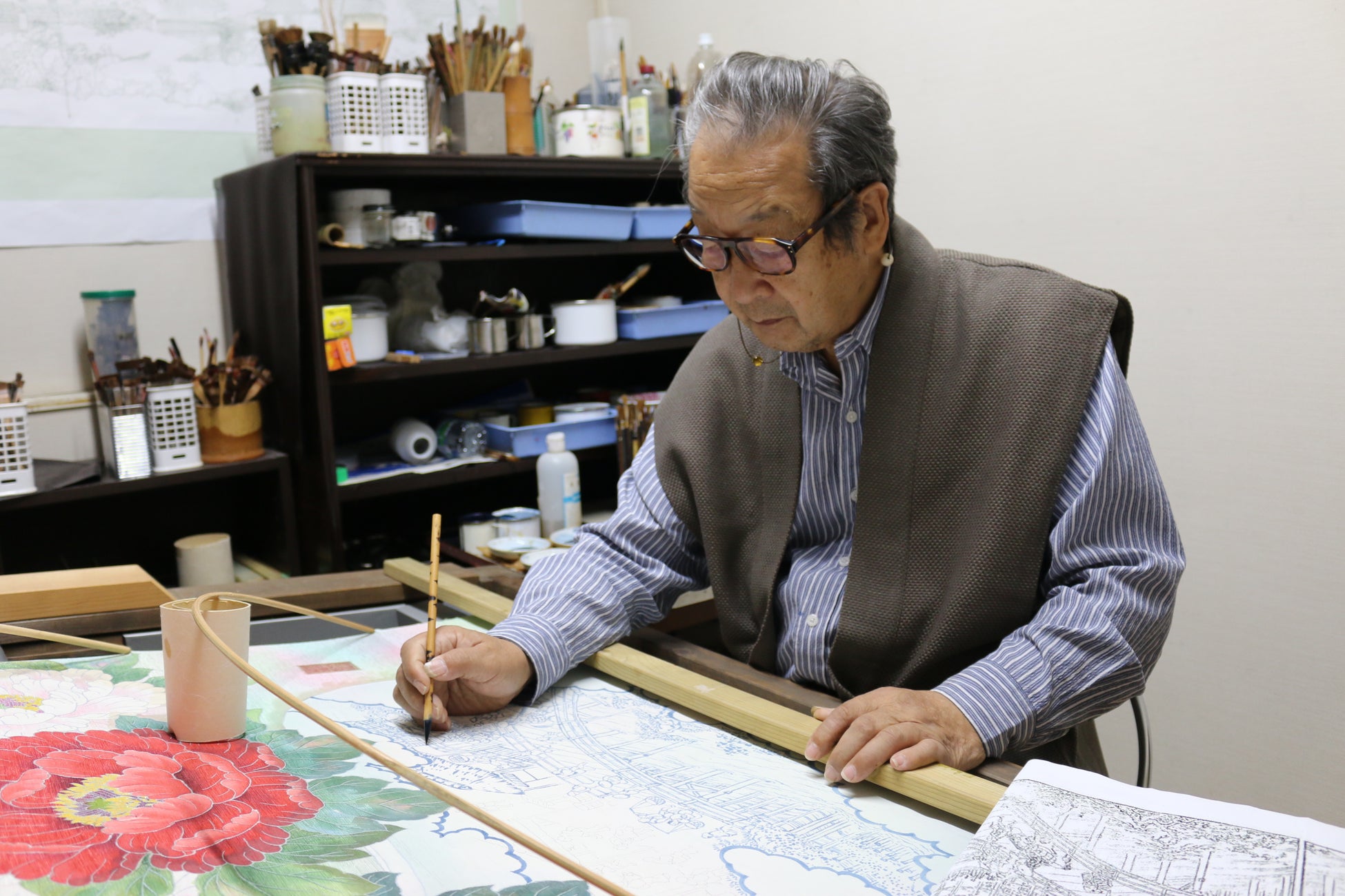 近年では、平成29年に「東京都優秀技能者(東京マイスター)」、令和元年に「卓越した技能者(現代の名工)」を受賞。令和4年には、業務に精励し、他の模範となるような技術や事績を持つ方に授与される「黄綬褒章」を受章し、令和5年には「板橋区政功労者」として表彰されました。また、友禅染の教室を開くなど、技術の継承にも尽力しています。