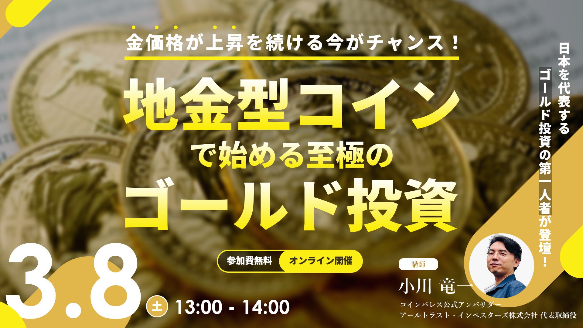 コインパレス公式アンバサダー R-TRUST investors Inc. 小川竜一氏が幻冬舎ゴールドオンラインセミナーにて今話題のゴールド投資について語ります。(2025年3月8日[土]13:00)