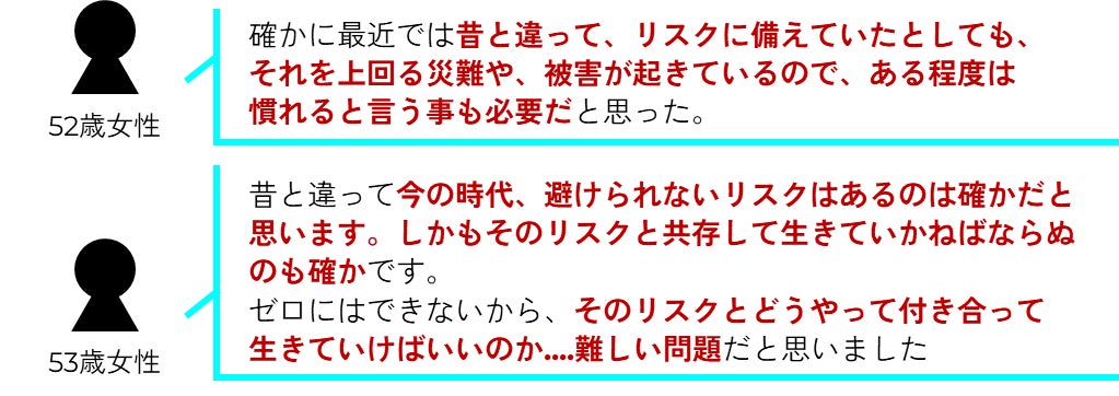 今回の見立てについて、QOが実施した検証調査*⁸では、全体の共感度は44.2%に留まりましたが、X世代女性では「時代に合っている」の評価が60.9%と比較的高い結果となりました。自由回答からは、想定外のリスクに直面する機会が増えたと実感する一方で、その対応の難しさを感じている様子がうかがえます。