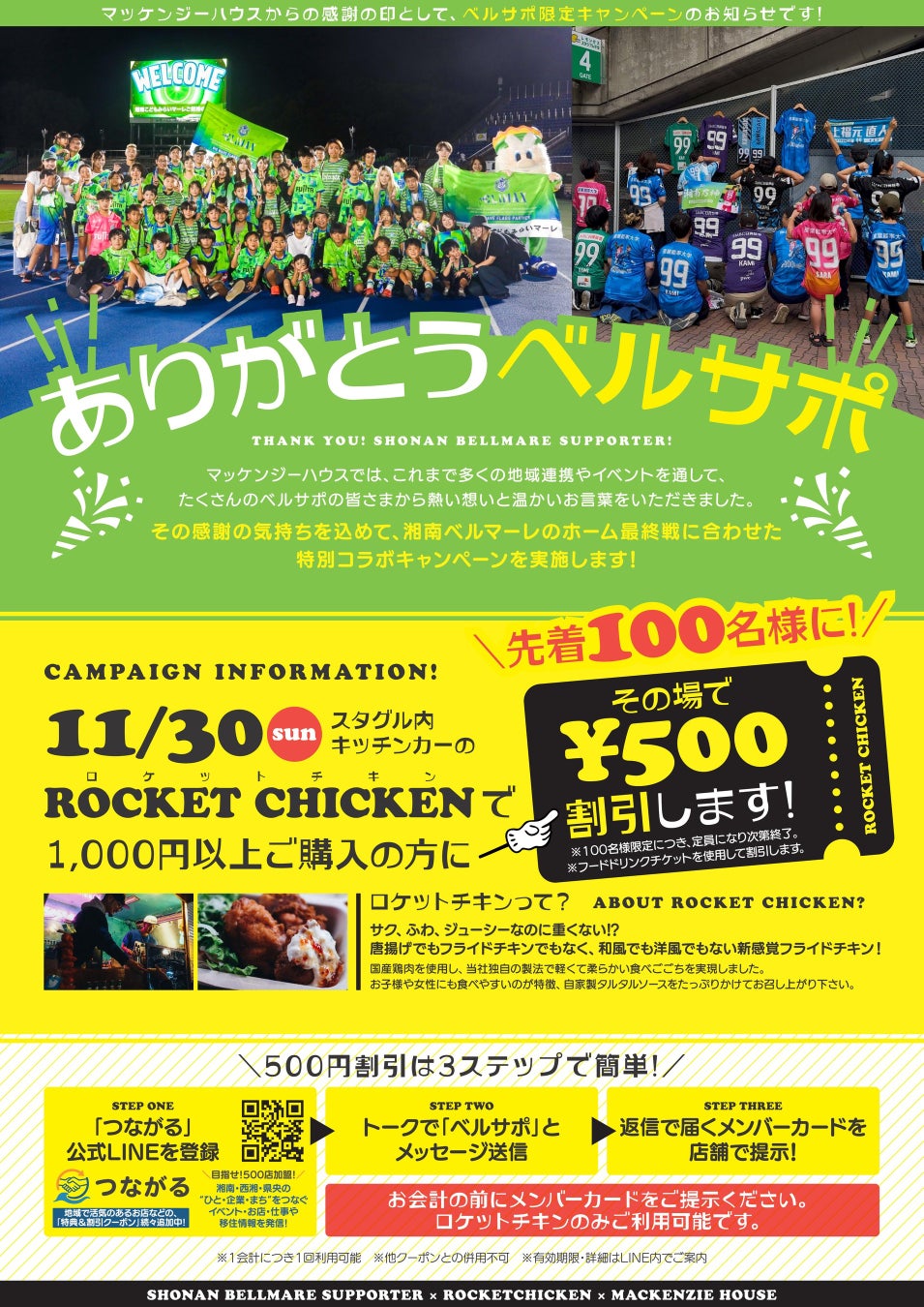 湘南・西湘・県央エリアで地域密着の家づくりを行う株式会社マッケンジーハウス(本社:神奈川県平塚市、代表取締役:大久保英二)は、湘南ベルマーレのホーム最終戦に合わせて、地域応援プロジェクト「ベルサポ限定!ロケットチキン500円割引キャンペーン」を開催いたします。