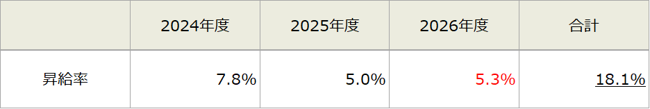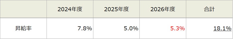 以上の観点から、2026年4月1日より全社員*を対象として管理職で月額5,000円、非管理職で月額12,000円の賃金改定を実施いたします。今回の賃金改定(定期昇給含む)による引き上げ幅は全体で平均5.3%となります。なお、直近3年間では合計18.1%の引き上げとなります。