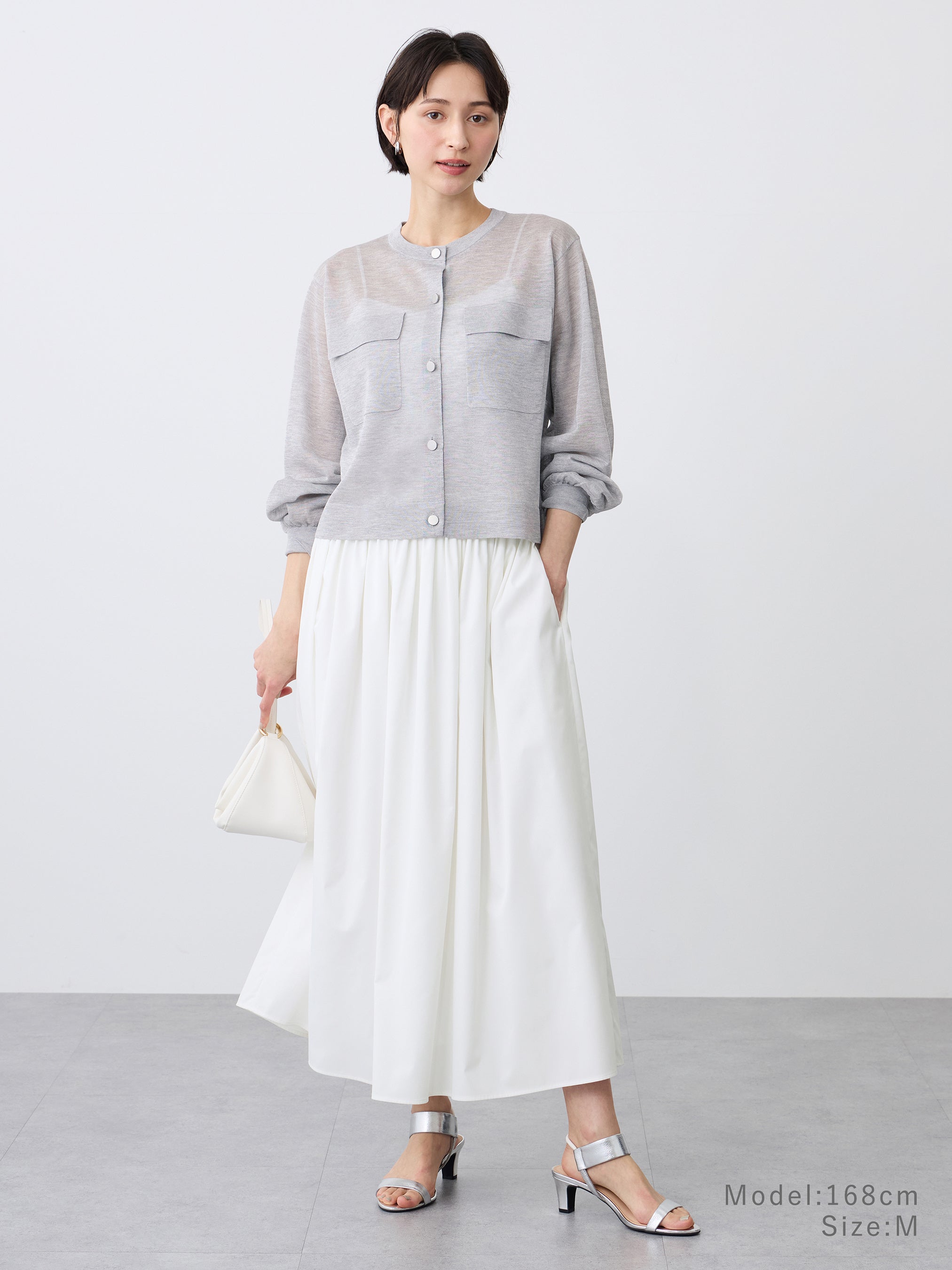 胸ポケット付きのジャケットライクなシアーカーディガン。
