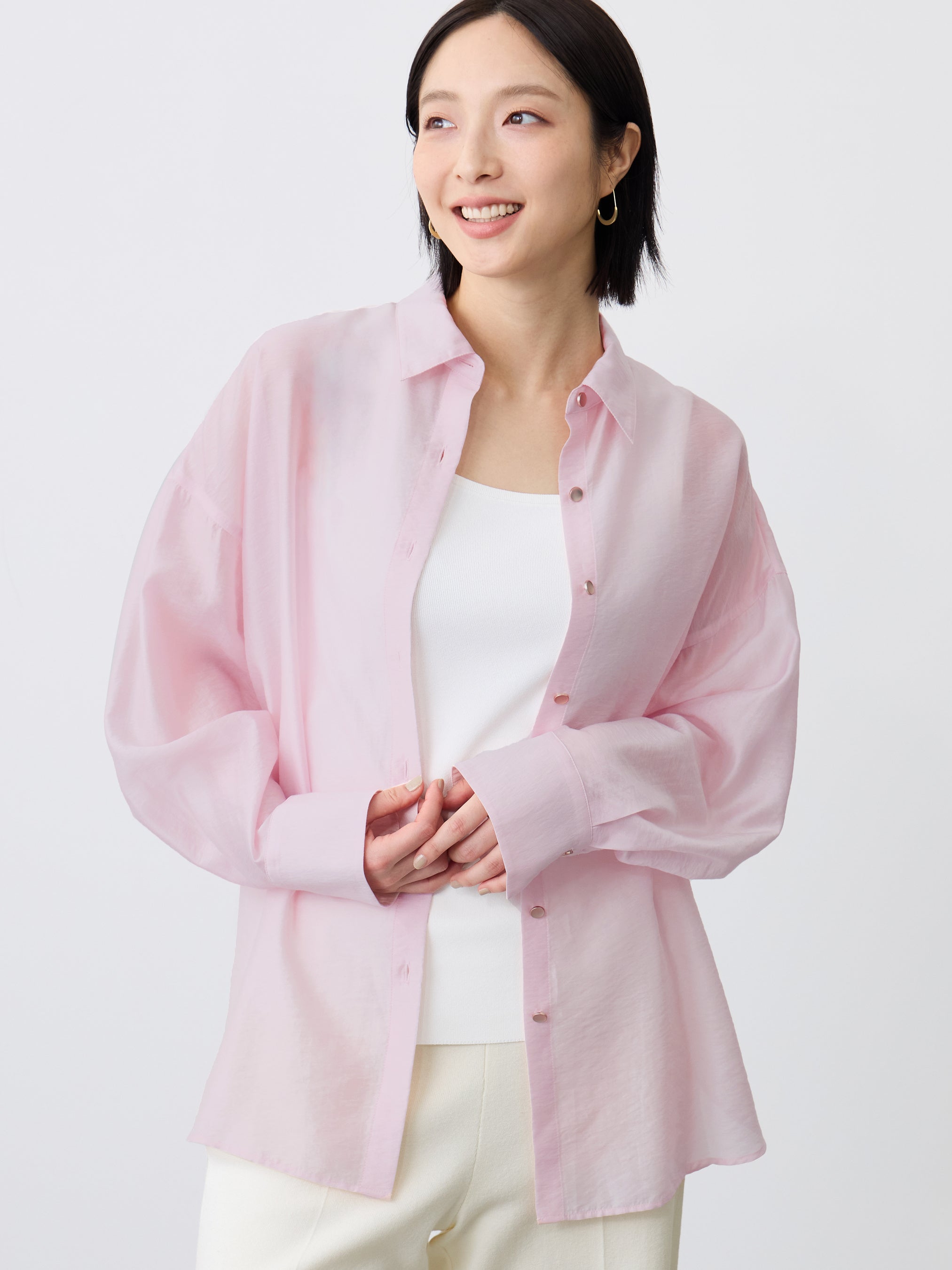 軽やかで、ほどよい透け感のシアー素材が上品なメタルボタンシャツ。ゆったりとしたシルエットでリラックス感がありながらも、肩周りはフィットさせることで着ぶくれしにくいデザイン。