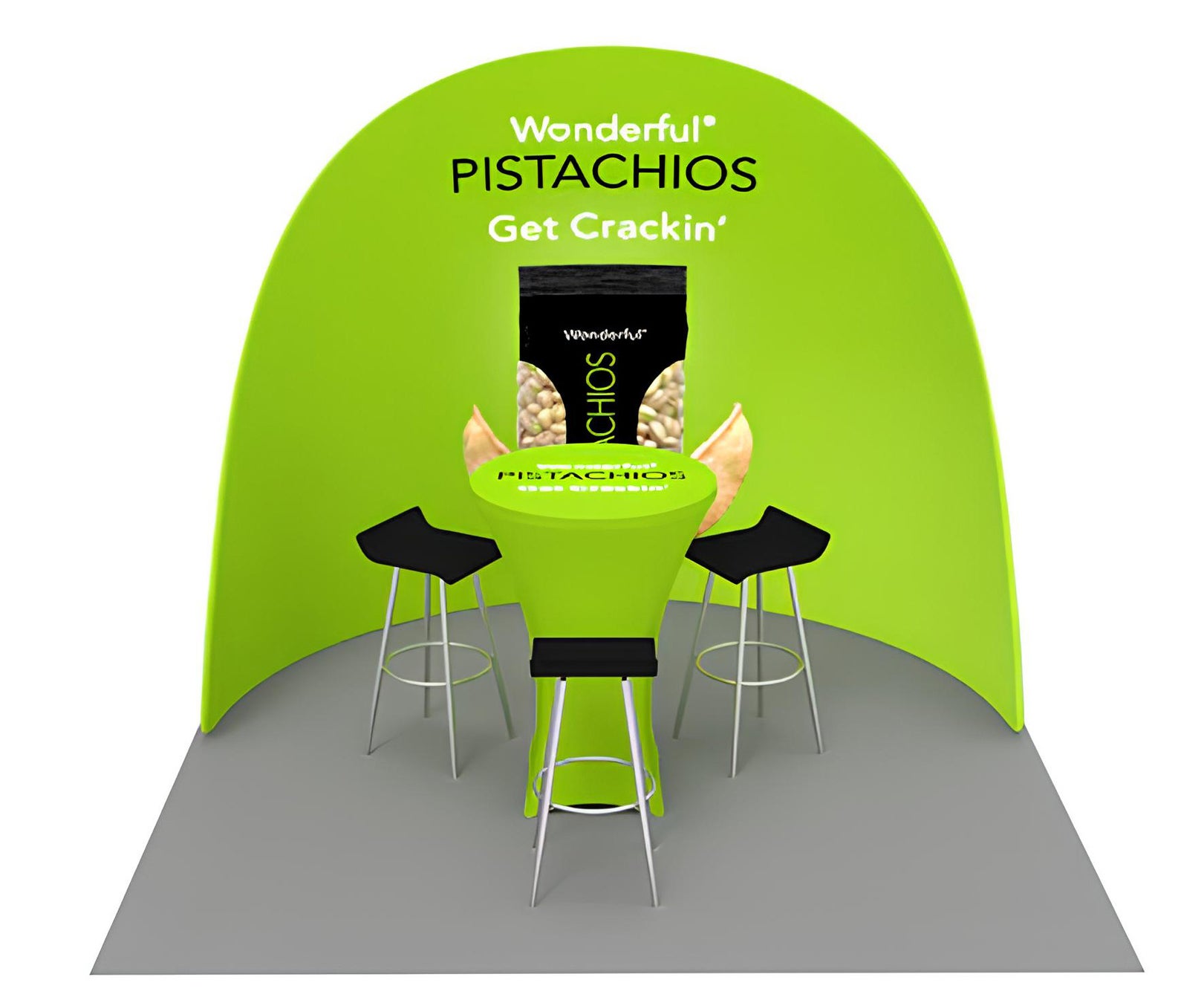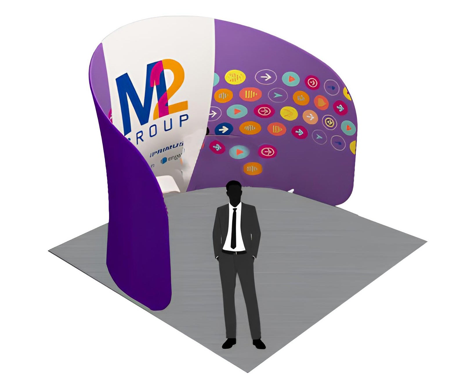 フレームでアシンメトリーな曲線を大胆に描き、マーケティングメッセージをスタイリッシュに表現するファブリックディスプレイ。