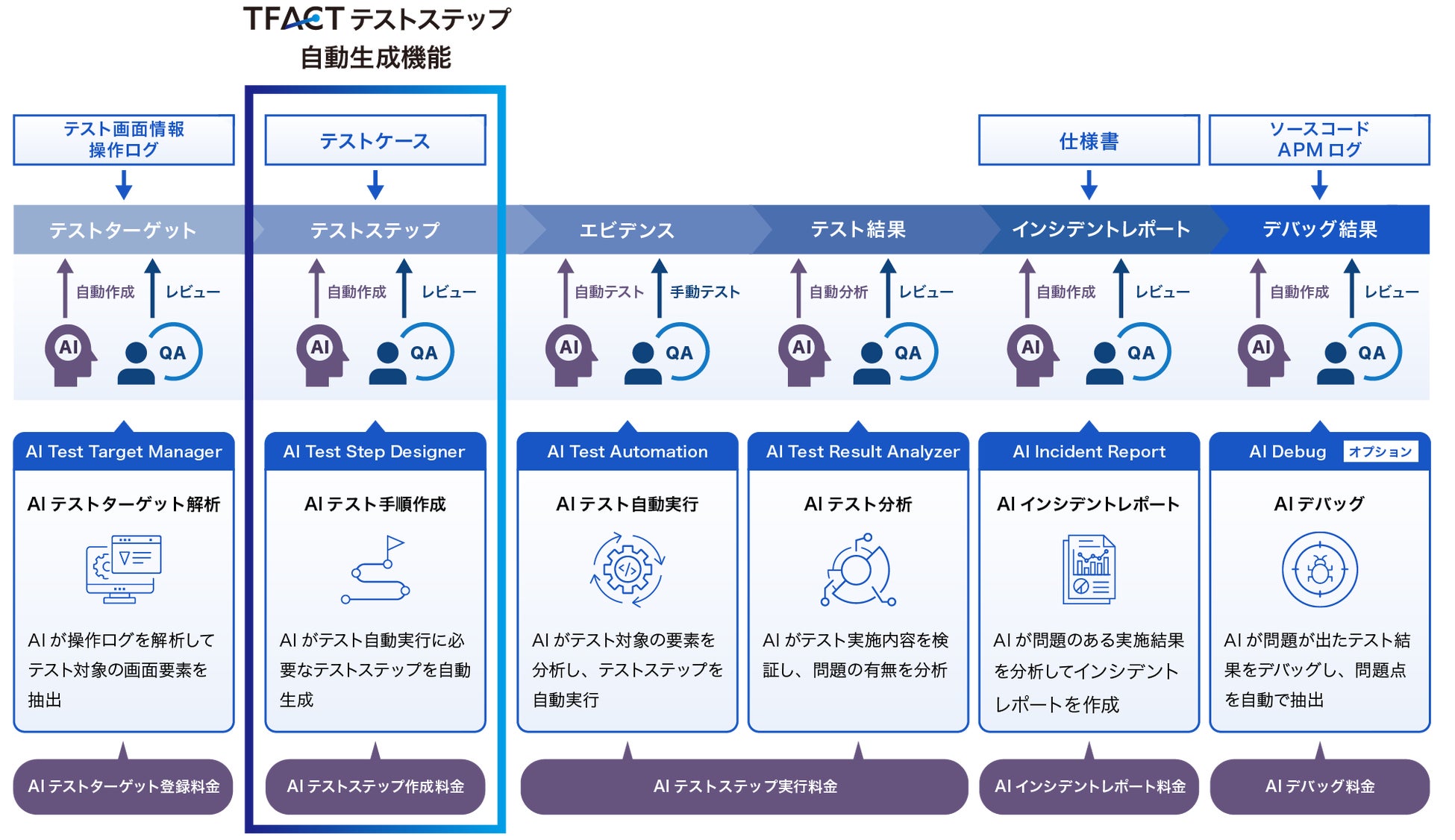本機能はテストケースとテスト対象を「TFACT」にインプットすることで、AIがテスト自動実行に必要となる具体的なテストステップを自動的に生成します。これにより、従来手動で行っていたテスト準備の作業負荷を劇的に軽減させるとともに、手作業によるミスを無くし、テスト全体の品質と精度の向上を同時に実現します。