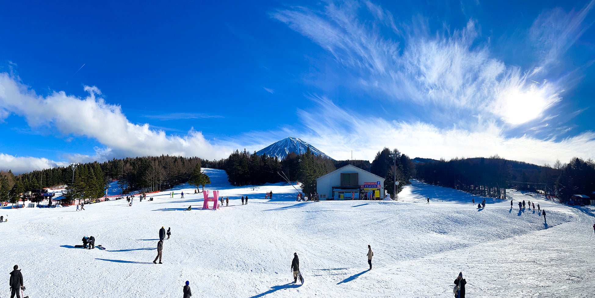 ふじてんスノーリゾートは、富士山の麓・標高約1300m地点に位置するスキー場です。新宿・横浜・静岡から車で90分という好アクセスで日帰りスキーに適しており、コースは初級者~中級者向けが中心で、ファミリーや友人同士など幅広くスキー・スノーボードが楽しめます。