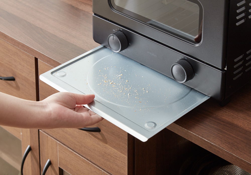 焼き網は取り外して丸洗い可能。パンくずトレー付きで庫内のお掃除もラクラク。付属の受け皿はピザやフライドポテトにも便利です。