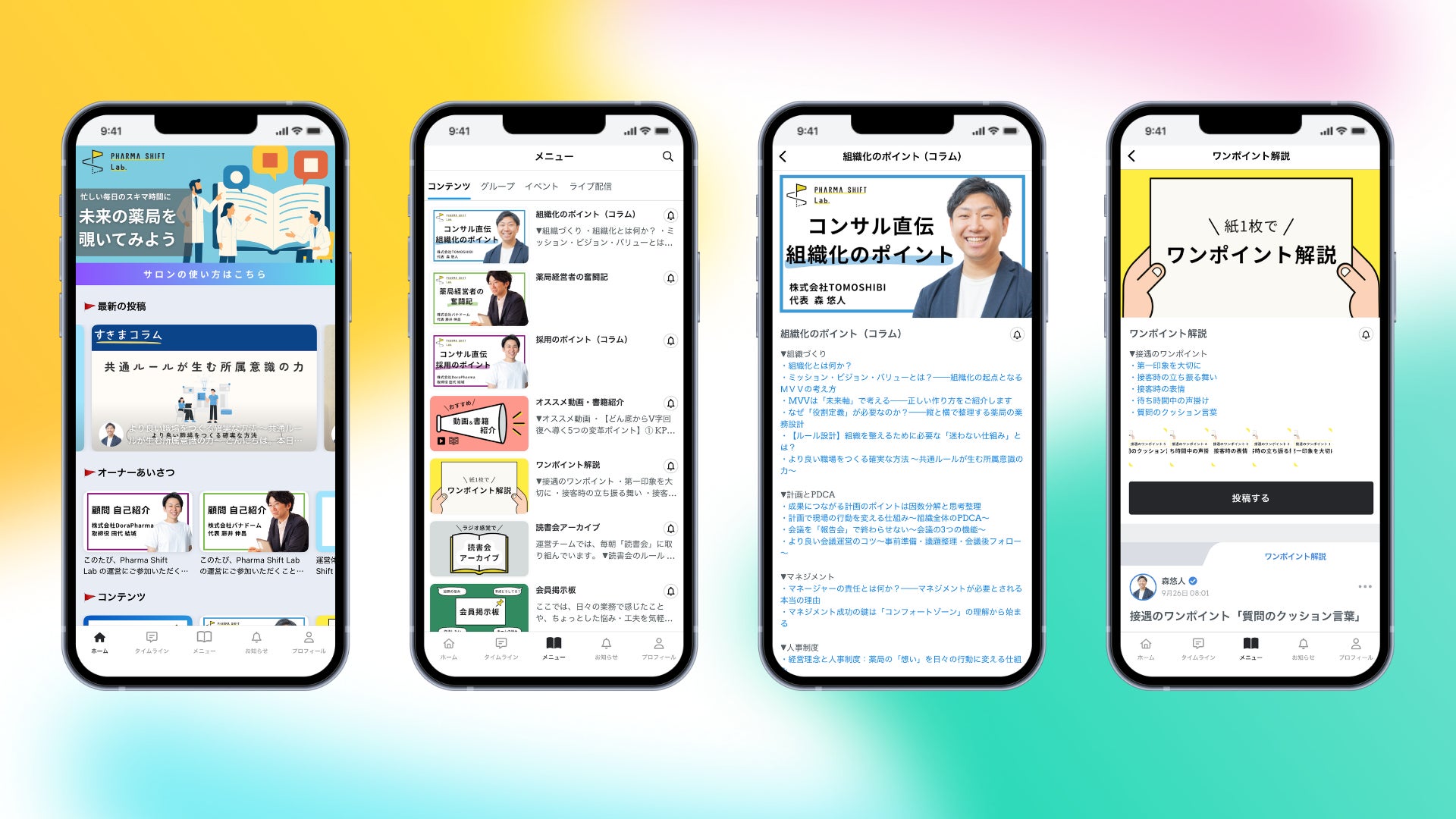 現在は薬局経営の現場に寄り添いながら、組織づくりや人材育成を支援しており、Pharma Shift Labではそうした現場での経験をもとに“学びと対話の場”を提供している。