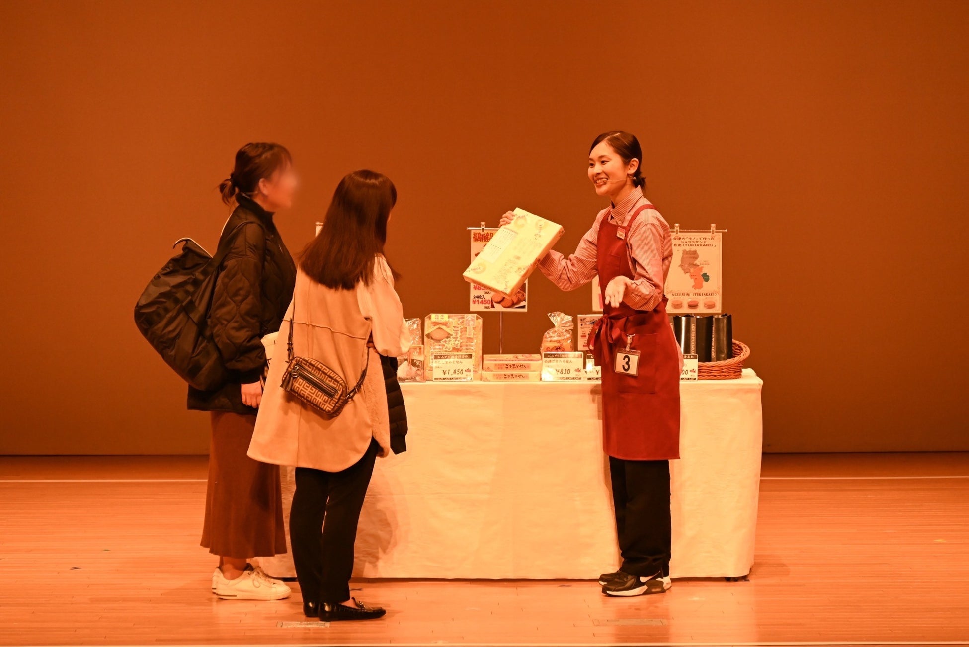 髙橋さんは、全国から選抜された代表の中でも臆することなく、美しい所作や姿勢、さらに滑舌のよい自然な話し方と明るい笑顔で演技を披露しました。また、お客さまとの会話から的確にニーズを把握し商品をお勧めしながら、会津の魅力も会場中にアピールしました。