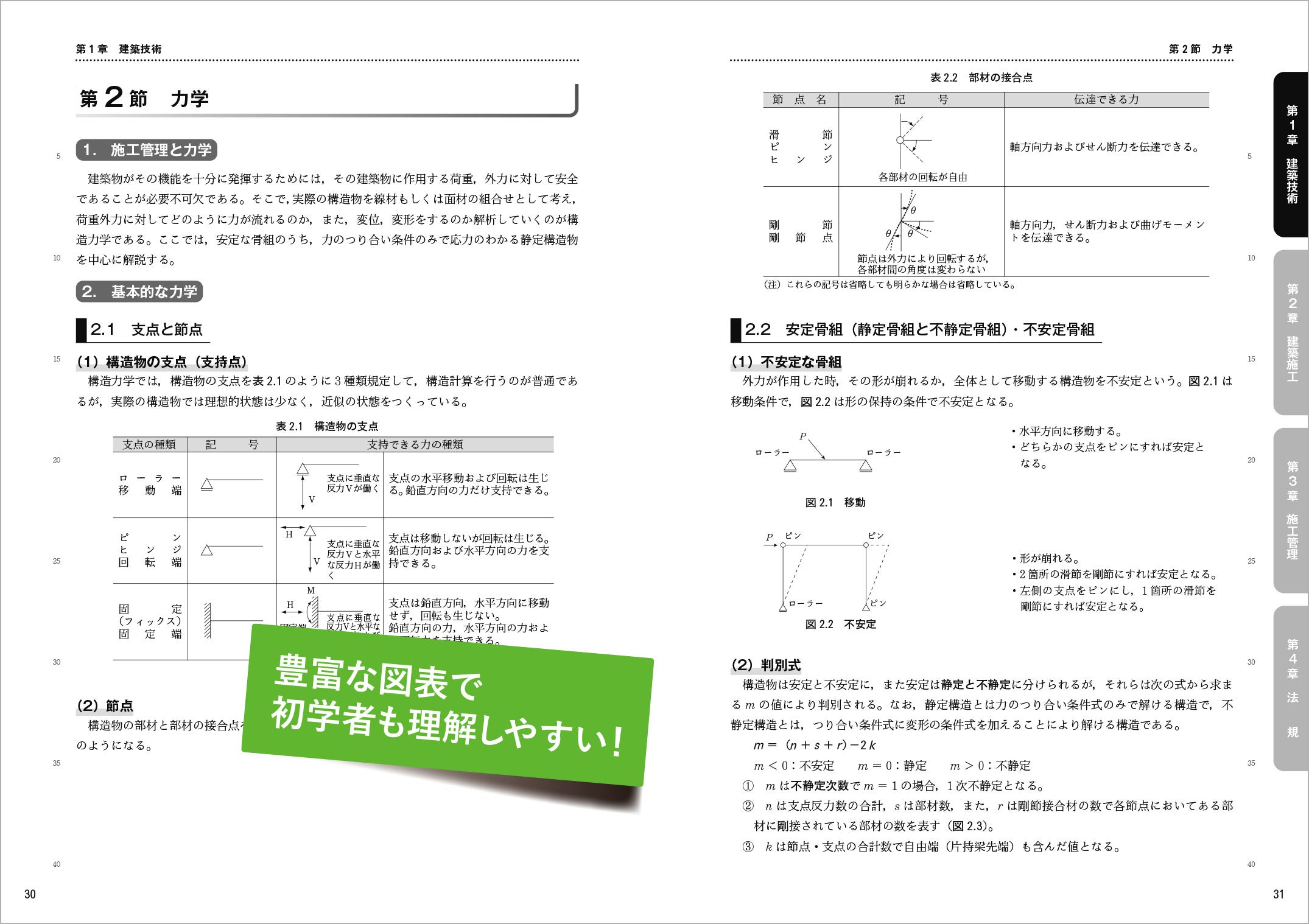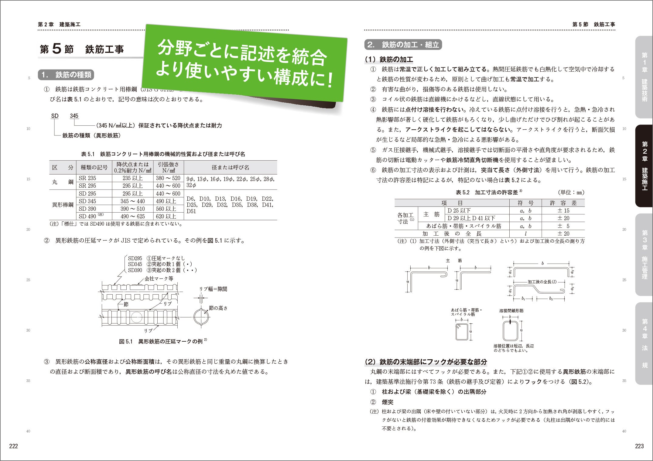 改訂第14版では構成を大幅に見直し、前版では「第2章 建築材料」「第3章 建築施工」と2つの章に分かれていた記述内容を分野ごとに統合・整理して、2分冊構成から1冊へと統合を図りました。これにより、材料と施工方法など関連する知識をまとめて把握・理解できるようになり、学習時の利便性が一段と向上しました。
