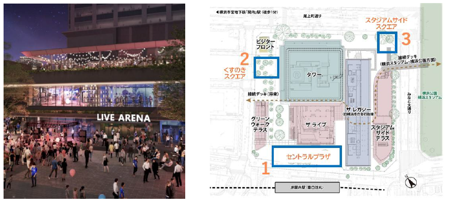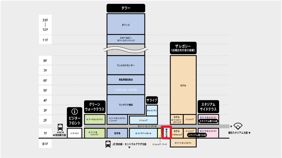 タワー :オフィス・大学、新産業創造拠点、エデュテインメント施設、商業 ザ レガシー(旧横浜市庁舎行政棟):ホテル、商業 ザ ライブ :ライブビューイング施設、商業 グリーンウォークテラス :商業 スタジアムサイドテラス :商業 ビジターフロント :観光案内所 |